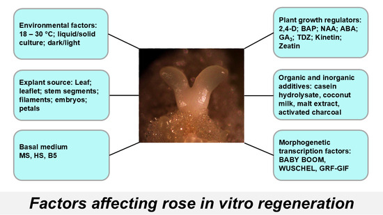 - Mahmoud, I.M.A.; Hassanein, A.M.A. Essential factors for in vitro regeneration of rose and a protocol for plant regeneration from leaves. Hortic. Sci. 2018, 45, 83–91. [Google Scholar] [CrossRef]
