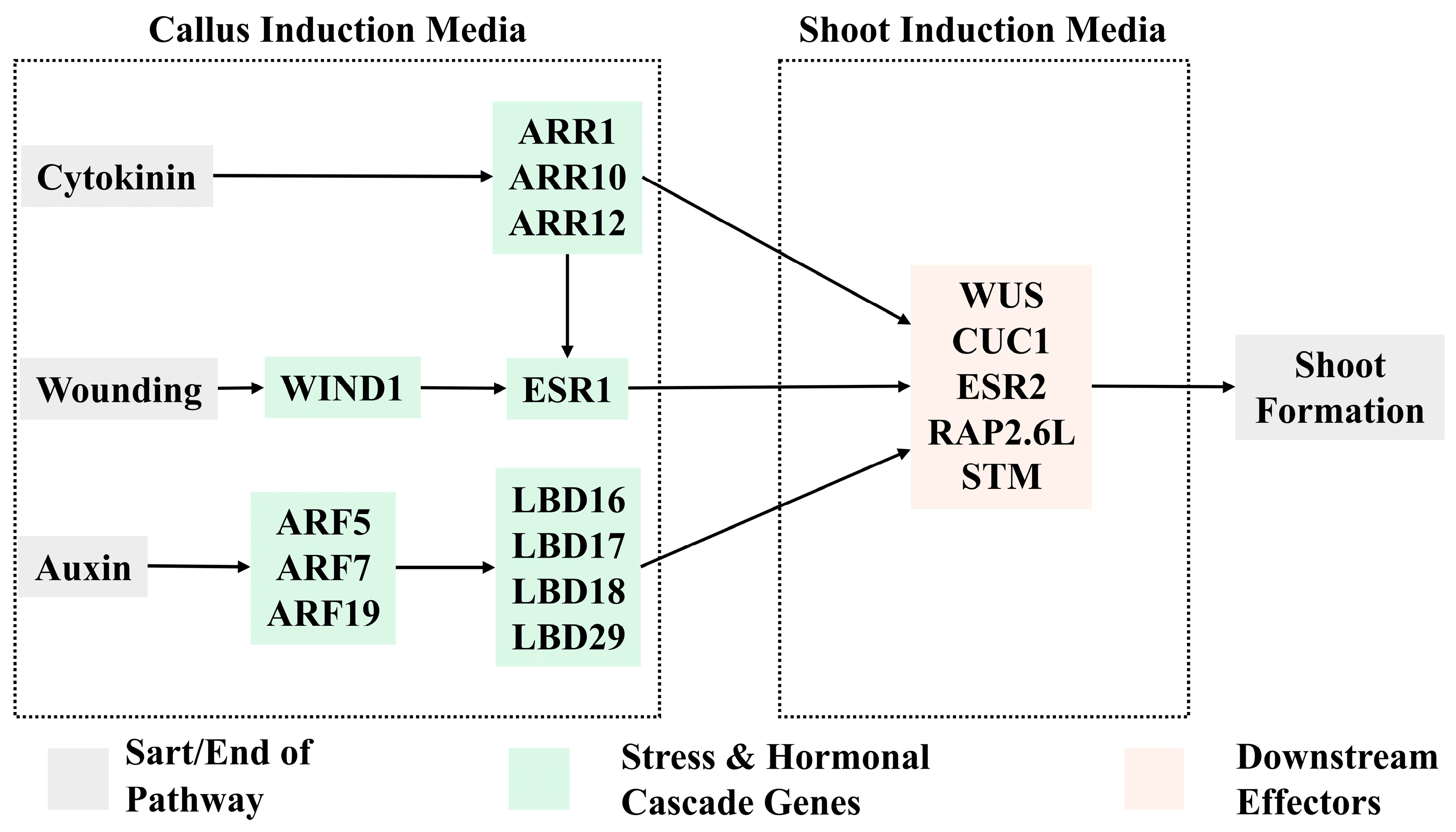 - Iwase, A.; Harashima, H.; Ikeuchi, M.; Rymen, B.; Ohnuma, M.; Komaki, S.; Morohashi, K.; Kurata, T.; Nakata, M.; Ohme-Takagi, M.; et al. WIND1 Promotes Shoot Regeneration through Transcriptional Activation of ENHANCER OF SHOOT REGENERATION1 in Arabidopsis. Plant Cell 2017, 29, 54–69. [Google Scholar] [CrossRef]