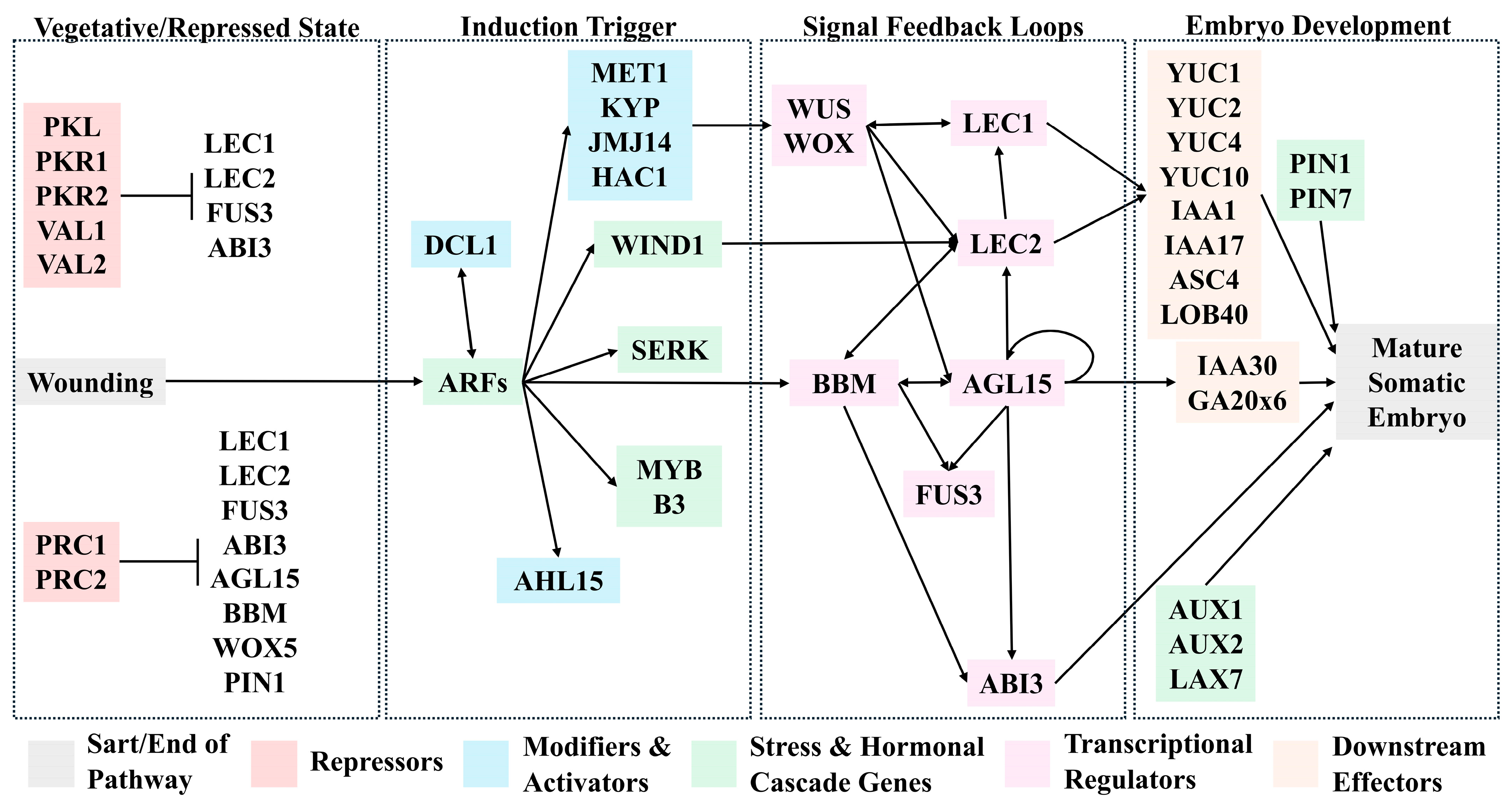 - Salaün, C.; Lepiniec, L.; Dubreucq, B. Genetic and Molecular Control of Somatic Embryogenesis. Plants 2021, 10, 1467. [Google Scholar] [CrossRef] [PubMed]