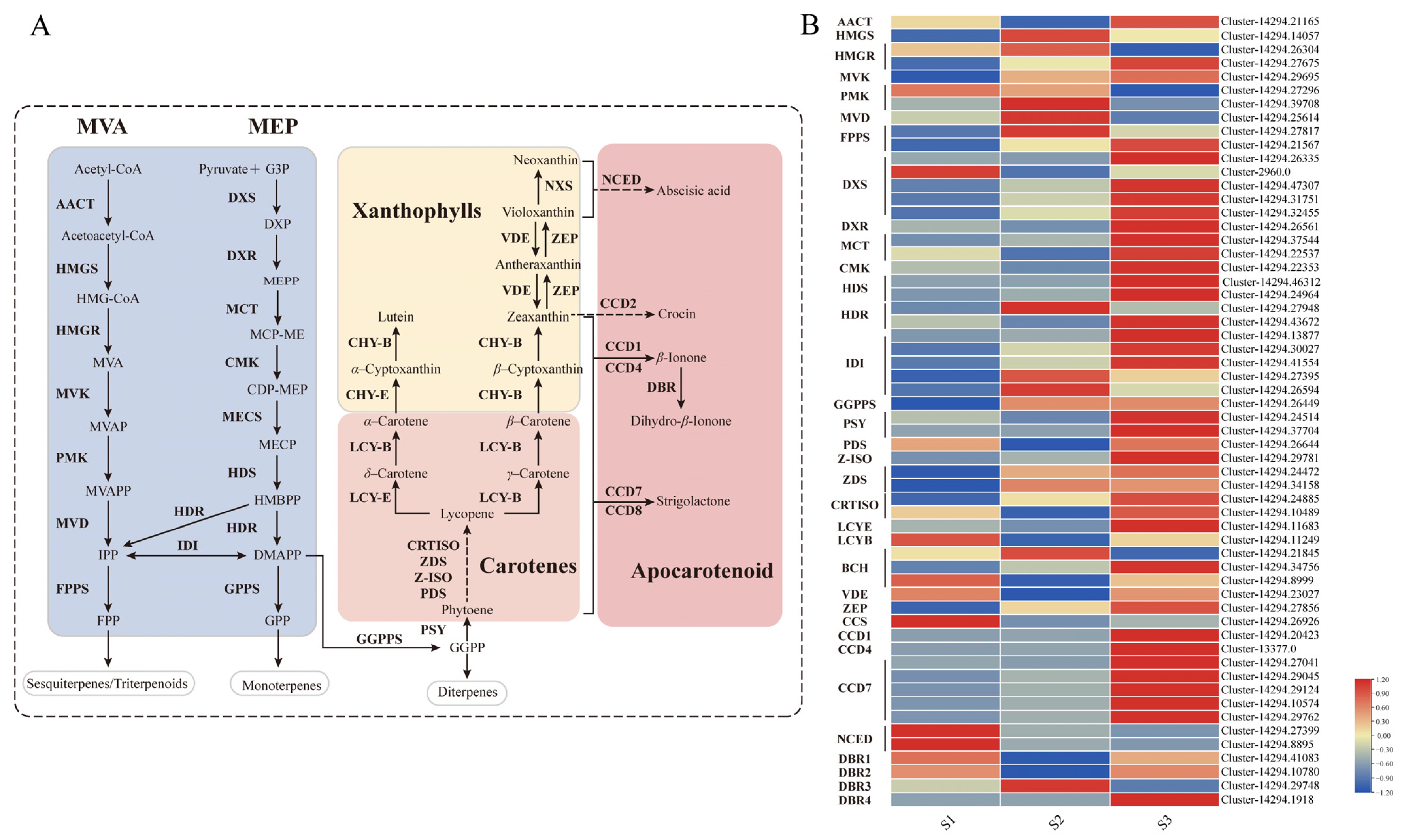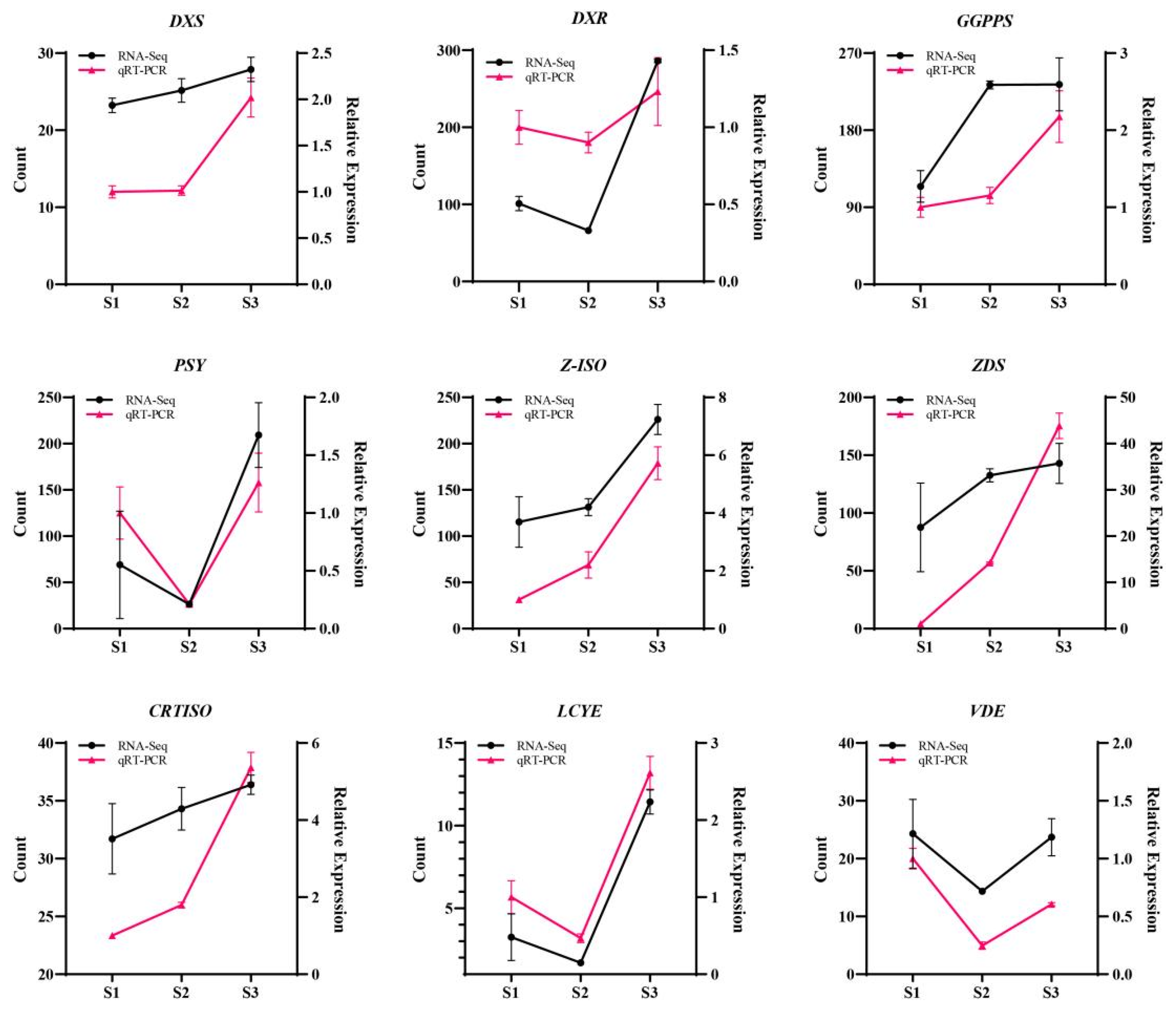 2.4. Analysis of Carotenoid Biometabolic Pathway