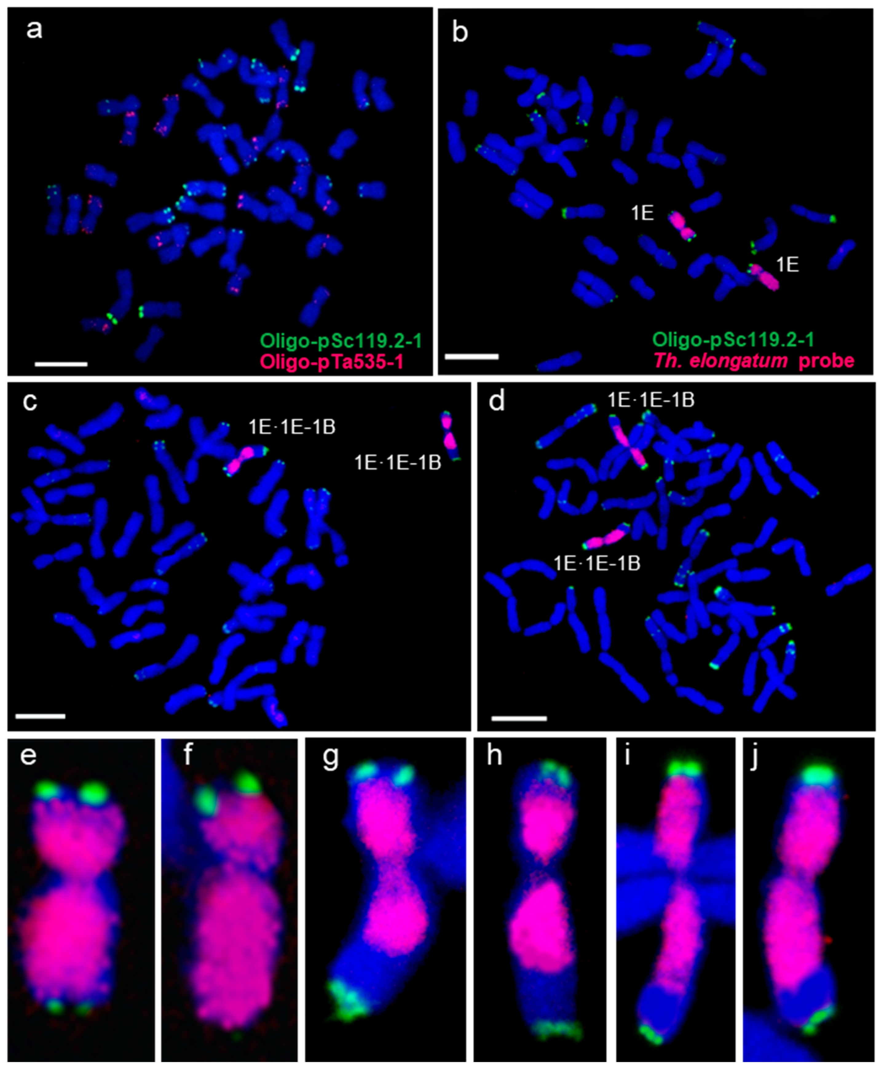 - Tang, Z.; Yang, Z.; Fu, S. Oligonucleotides replacing the roles of repetitive sequences pAs1, pSc119.2, pTa-535, pTa71, CCS1, and pAWRC.1 for FISH analysis. Appl. Genet. 2014, 55, 313–318. [Google Scholar] [CrossRef]