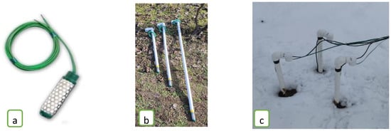 (a) Humidity sensor; (b,c), positioning of humidity sensors in the vineyard.