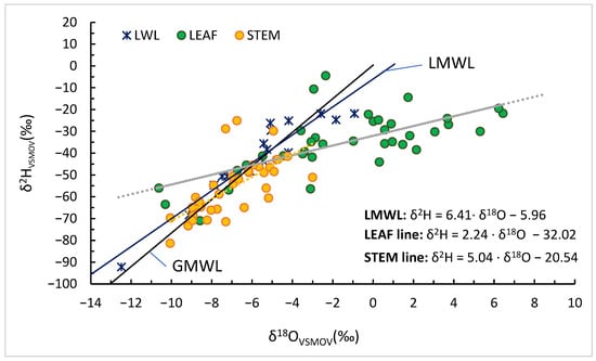 The comparative slopes of the three water pools provide diagnostic information on the magnitude and mechanism of fractionation. The LMWL slope of 6.41 represents meteoric water; the stem line of ~5.0 reflects moderate evaporative enrichment, characteristic of xylem water partially influenced by isotopically fractionated soil moisture; and the leaf line of ~2.2 indicates intense transpiration-driven enrichment governed by kinetic effects. The observed hierarchy of slopes (6.41 > 5.04 > 2.24) illustrates the progressive enrichment from precipitation to stem to leaf, delineating the soil–plant–atmosphere continuum of isotopic modification.