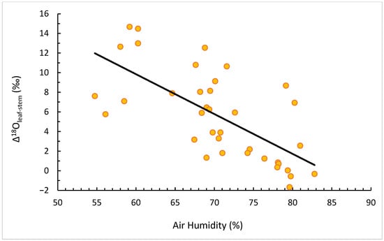 The correlation between Δ18O (leaf–stem) and RH.