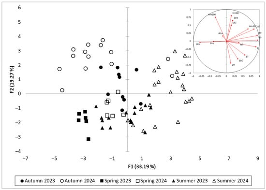 The corresponding PCA of seasonal observations shows clear separation by season along F1, with spring and autumn samples predominantly distributed in the negative F1 space, corresponding to higher humidity and lower evaporative demand. In contrast, samples from summer 2024 cluster in the positive F1 quadrant, reflecting elevated ET, higher δ13C and δ15N values, and increased soil water tension. The summer 2023 samples are more scattered, consistent with the milder and less sustained drought conditions observed that year. This temporal and seasonal separation confirms the ability of the PCA to resolve the progression of drought and associated physiological responses within the vineyard system.