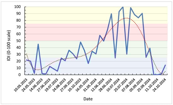 Weekly Isotopic Drought Index (IDI0–100) for 2023–2024, with LOWESS trend and drought severity thresholds (blue: <25 → humid conditions, green: 25–50 → moderate water stress, red: 50–75 → pronounced drought, yellow: >75 → severe drought).