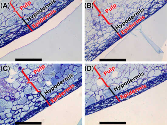 Optical microscopy images of sections of the skins of the treated and control grapes. (A) Control grapes (B) MeJ-treated grapes (C) ChNPs treated grapes and (D) MeJ-ChNPs treated grapes.