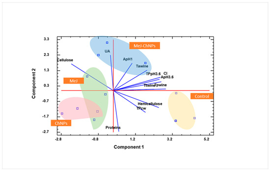 Analysis of the PCA biplot revealed distinct patterns in the distribution of treatments along the first two principal components. PC1, which corresponds to the horizontal axis and accounts for a substantial proportion of the total variance, delineated a clear separation between control and treated samples. Control samples were predominantly located on the positive side of PC1, influenced by high loadings of TPwine, TPpH3.6, ApH3.6, and CI. In contrast, the MeJ and ChNPs treatments were situated on the negative side of this component, primarily associated with elevated Cellulose content. This axis effectively captures a fundamental divergence in cell wall composition and phenolic characteristics between untreated and treated wine samples.