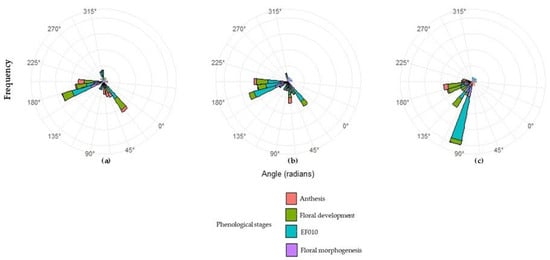 Circular analysis of phenological synchrony for the plots evaluated. (a) Plot 3, (b) Plot 5, (c) Plot 23.