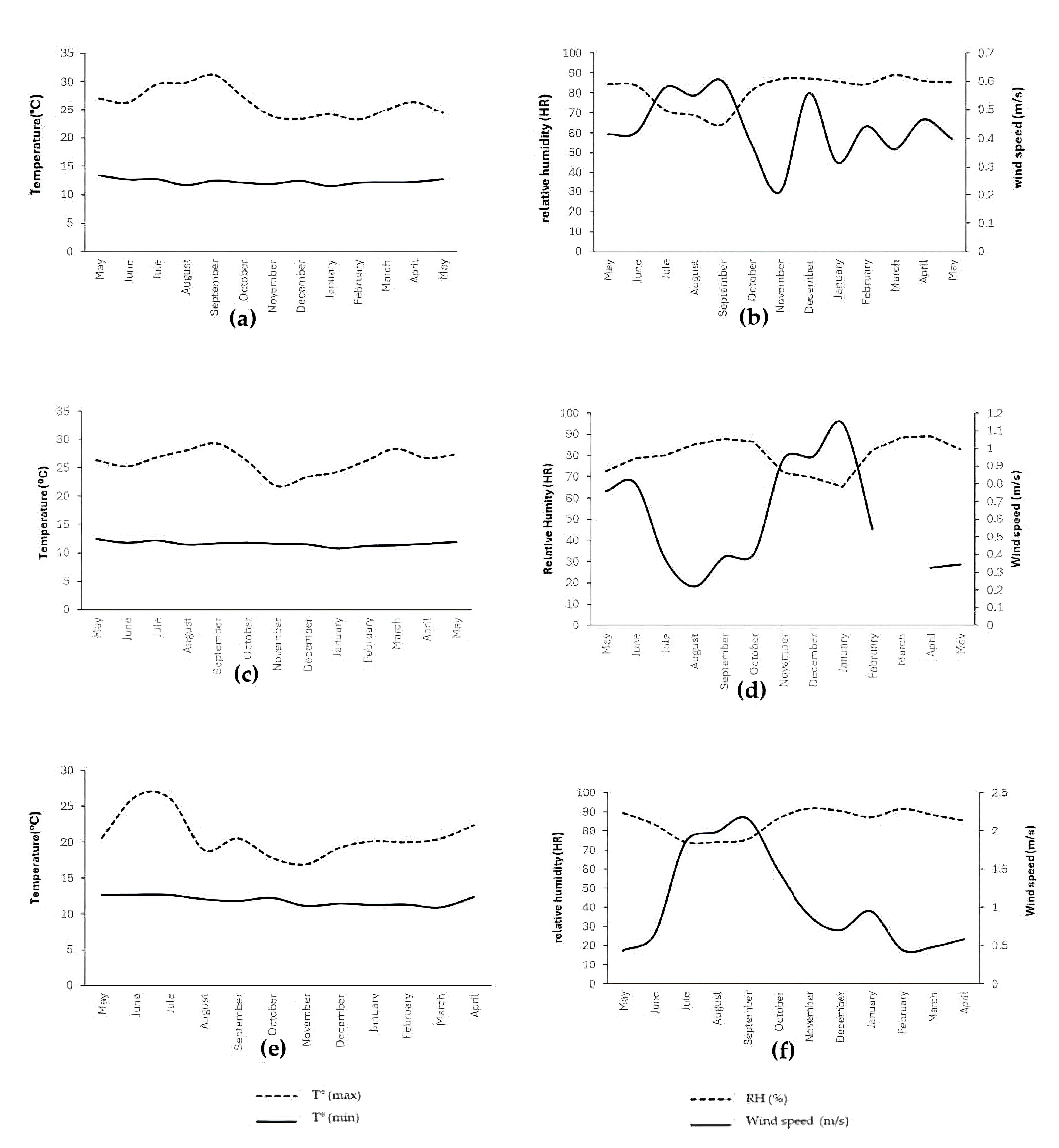 Phase I: Environmental temperature series (mean, maximum, and minimum, °C), relative humidity (RH), precipitation (mm), and wind speed (mean and maximum, m·s−1) were evaluated. The precipitation variable was transformed using log (x + 1) to reduce skewness, and relative humidity was expressed as a proportion (0–1) to improve comparability among variables. Descriptive statistics and correlations were computed as input for subsequent multivariate analyses.