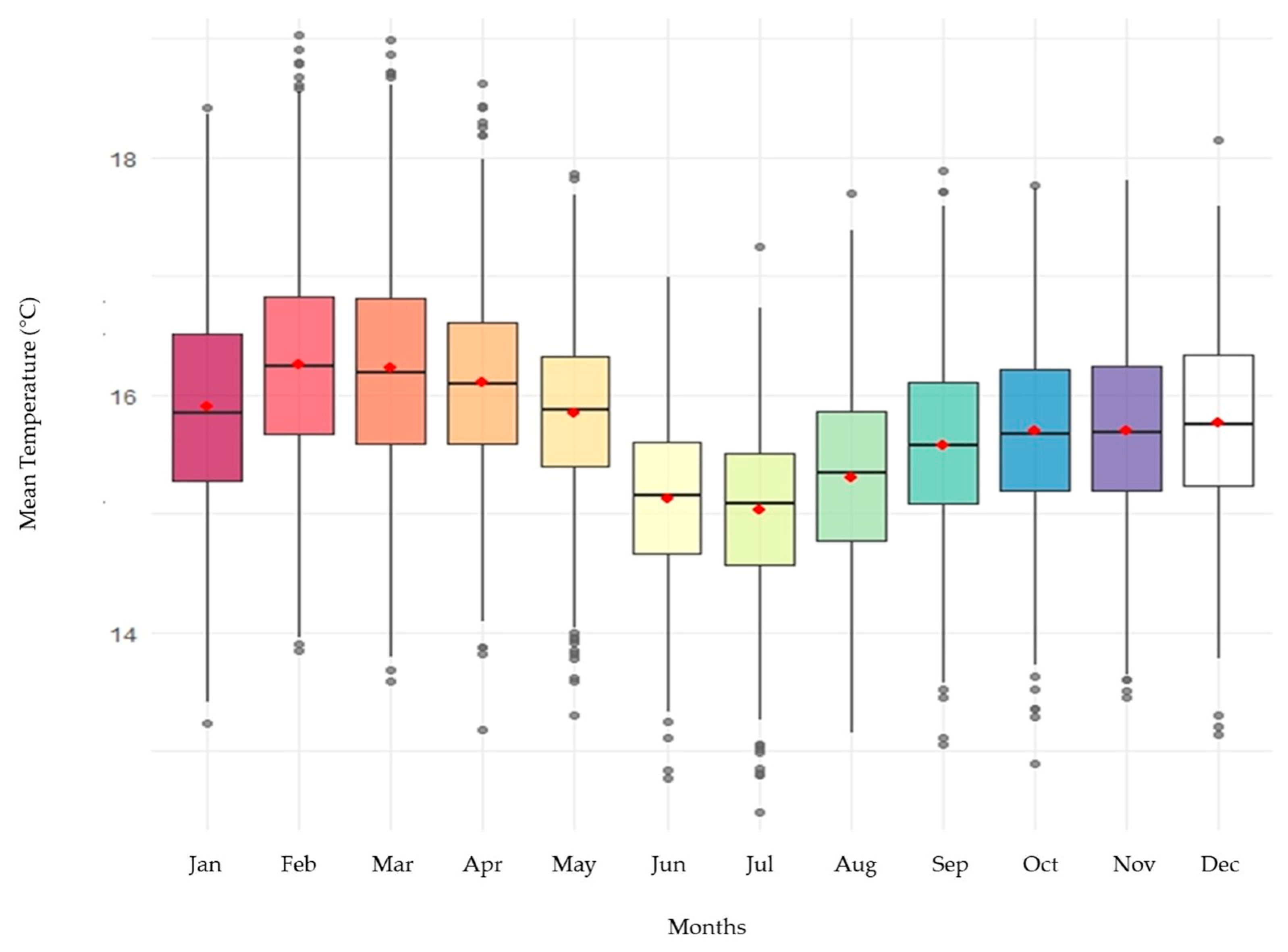 Figure 2) showed clear differences among months, especially for Tmin, with lower values during the middle of the year. These patterns were statistically validated using one-way Welch’s ANOVA, which revealed significant differences among months for all three variables (Tmax: F = 57.2; Tmin: F = 307.9; Tmean: F = 197.2;