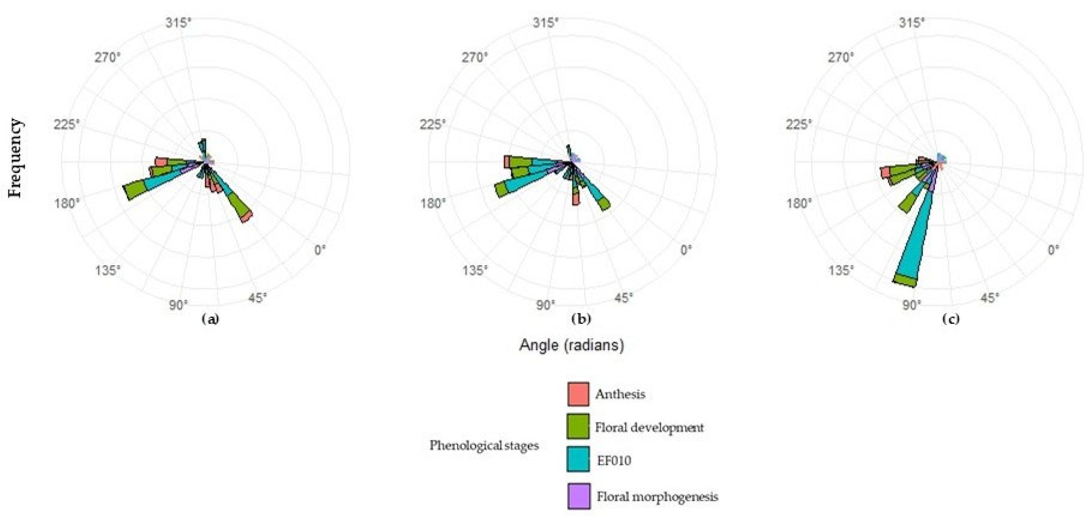 Phase V. Circular analysis: To describe the synchrony and temporal distribution of the main phenological events, a circular statistical analysis was applied using the phenological factors derived from the confirmatory factor analysis. This approach allowed the recurrent events of the reproductive cycle to be represented in an angular space, where each observation was associated with an angle reflecting its relative position within the annual or thermal cycle.