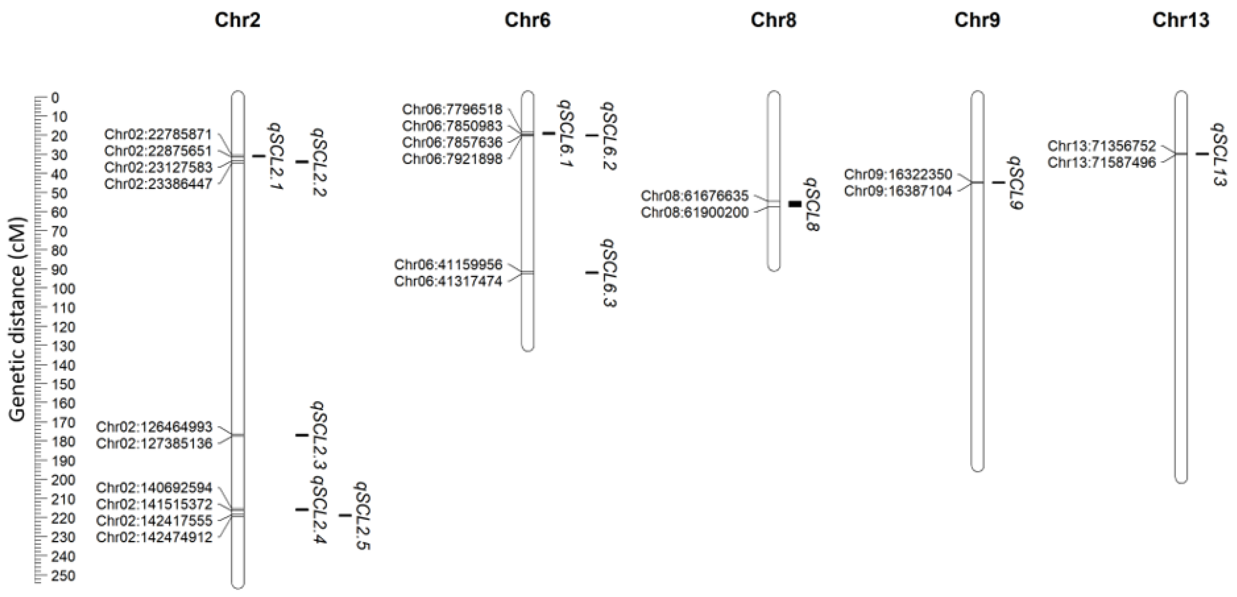 | qSCL2.5 | LL | Exp2 | 2 | Chr02:142417555 | Chr02:142474912 | 11.93 | 6.42 | −0.54 |
