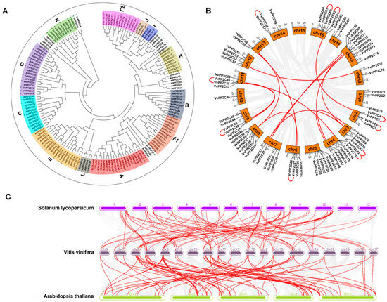 The evolutionary relationships among the 78 VvPP2C proteins were analyzed using a Neighbor-Joining (NJ) tree approach (Figure 1A). Following the classification scheme established for Arabidopsis, in which the PP2C genes were grouped into 13 clades [30], the VvPP2C genes were assigned to 12 clades, as no homologs corresponding to Arabidopsis clade G were identified in the grapevine genome. Eight VvPP2Cs (VvPP2C10/23/24/35/54/65/66/74) could not be assigned to any known clade. Clade A contained the largest number of members (11), whereas clade I contained only one. The VvPP2C genes were unevenly distributed across the 18 chromosomes (Figure 1B). Chromosome 18 harbored the greatest number (9), whereas chromosome 15 lacked VvPP2C genes entirely. The expansion of the VvPP2C family was further investigated by examining gene duplication events. Among all VvPP2C genes, 19 (24.35%) underwent 10 tandem duplication events, and 28 (35.89%) formed 14 segmental duplication pairs (Figure 1B; Table S1). These results indicated that both tandem and segmental duplications contributed substantially to the expansion of the VvPP2C family. Synteny analysis revealed 71 and 81 orthologous gene pairs between V. vinifera and A. thaliana and between V. vinifera and S. lycopersicum, respectively, implying that grapevine shares a closer evolutionary relationship with tomato than with Arabidopsis (Figure 1C; Tables S2 and S3).