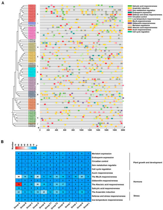 Composition and distribution of promoter cis-elements in VvPP2Cs. (A) Chromosomal locations of different cis-elements in VvPP2C promoters. Different colors indicate distinct types of cis-elements. (B) Heatmap showing the abundance of each cis-element type across promoters. The red and blue squares represent higher and lower counts, respectively.