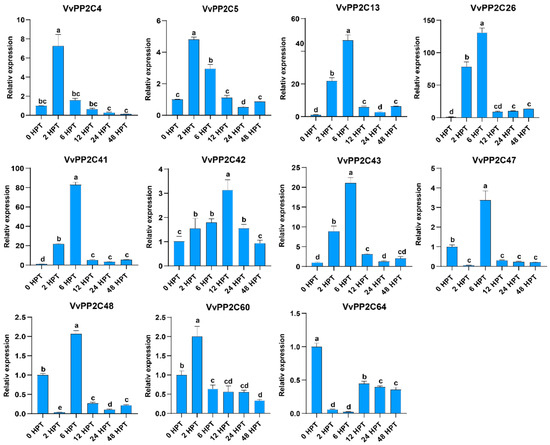 Expression profiles of VvPP2CAs in response to exogenous ABA treatment. Error bars represent SD (n = 3). Significant differences at p < 0.05, as assessed using Duncan’s multiple range test, are denoted by different lowercase letters.