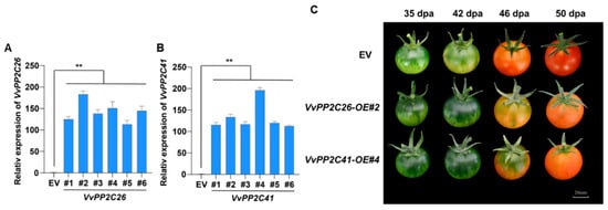 Given the pronounced ABA responsiveness and developmental expression changes in VvPP2C26 and VvPP2C41, these genes were hypothesized to function as negative regulators of fruit ripening. To validate their roles, overexpression (OE) lines of VvPP2C26 and VvPP2C41 were generated in tomato via Agrobacterium-mediated transformation, along with empty vector (EV) controls. qPCR verification confirmed the successful overexpression of target genes in six independent transgenic lines for each construct (Figure 7A). The lines VvPP2C26-OE#2 and VvPP2C41-OE#4 exhibiting the highest expression levels were selected for phenotypic assessment. Both VvPP2C26-OE#2 and VvPP2C41-OE#4 fruits displayed a marked delay in ripening compared with EV controls (Figure 7B). These results demonstrate that VvPP2C26 and VvPP2C41 function as negative regulators of fruit ripening, likely by modulating ABA-mediated signaling pathways.