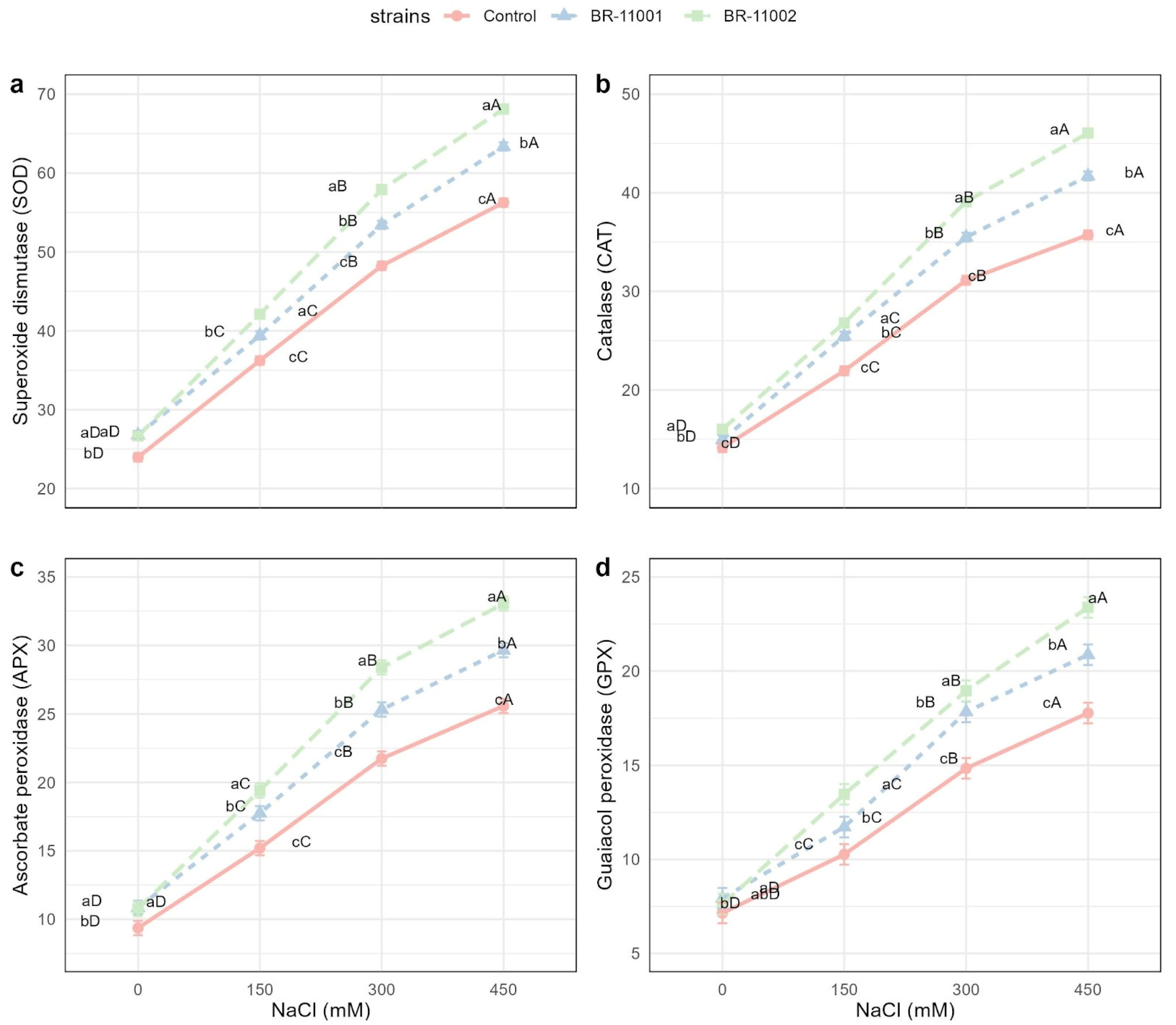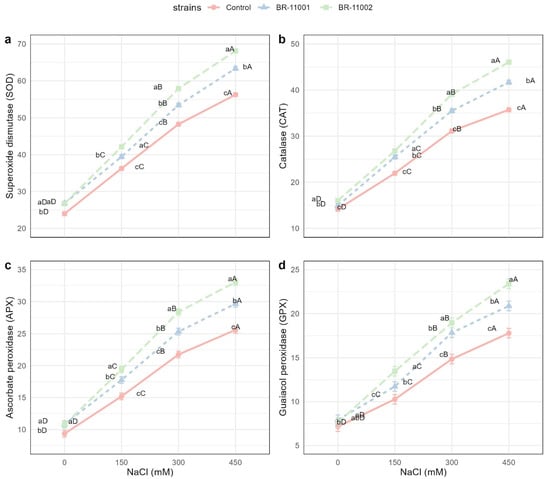 Figure 5. Antioxidant enzyme activity of Chenopodium quinoa seedlings subjected to salinity stress and inoculated with the A. brasilense strains BR-11001 and BR-11002. (a) Superoxide dismutase (SOD), (b) catalase (CAT), (c) ascorbate peroxidase (APX), and (d) guaiacol peroxidase (GPX). Enzyme activities are expressed as U min−1 mg−1 protein. The values represent the means ± SEs (n = 4). Different lowercase letters indicate significant differences among strains within each salinity level, and uppercase letters denote differences among salinity levels within each strain (Tukey’s HSD, p < 0.05).