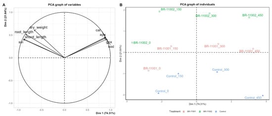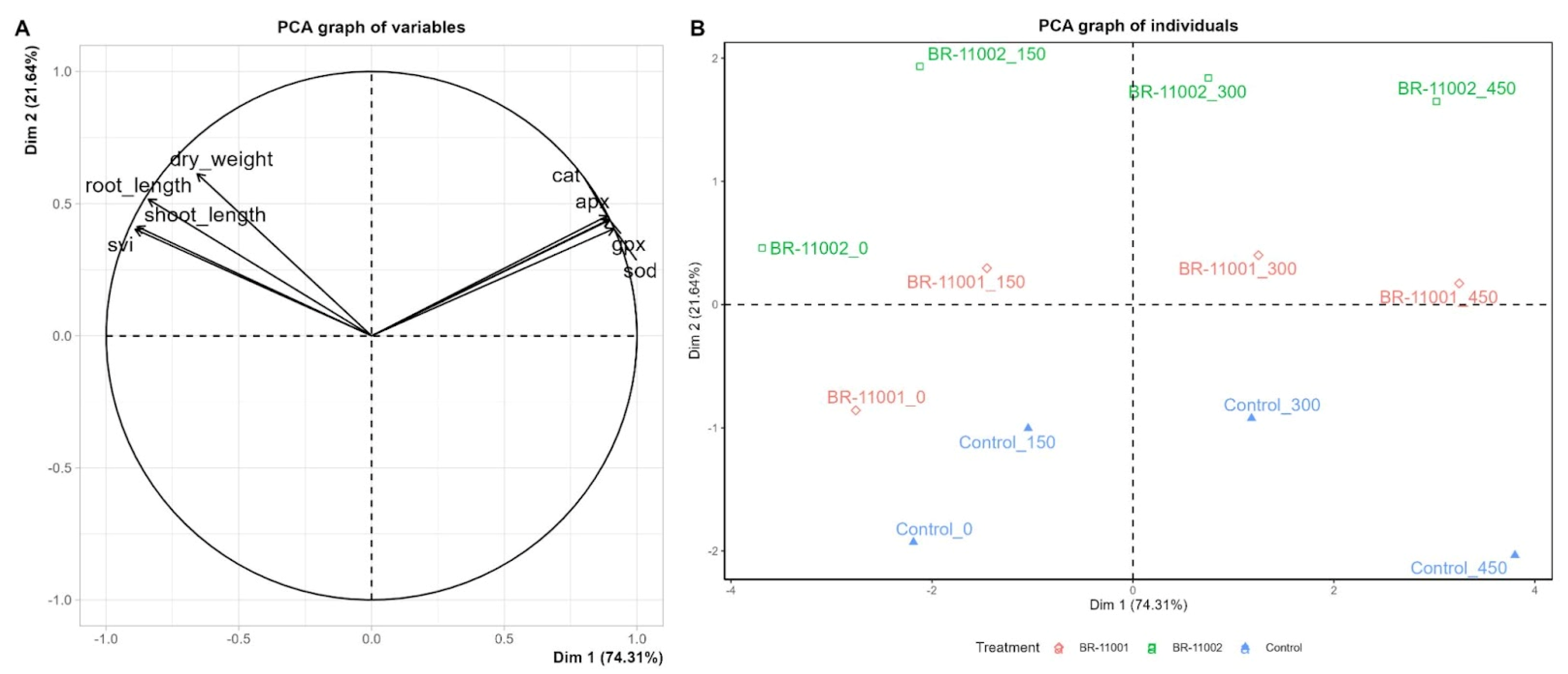 The distribution of individuals further revealed clear separation among the treatments (Figure 6B). Seedlings inoculated with BR-11002 were grouped in the upper-right quadrant across all NaCl concentrations, reflecting enhanced performance under saline conditions. In contrast, the BR-11001 treatments were positioned in intermediate zones, showing partial improvement compared with the controls but lower than that of BR-11002. The controls clustered in the lower-right to lower-left quadrants, particularly at relatively high salinity levels (300–450 mM), indicating reduced growth and stress tolerance.