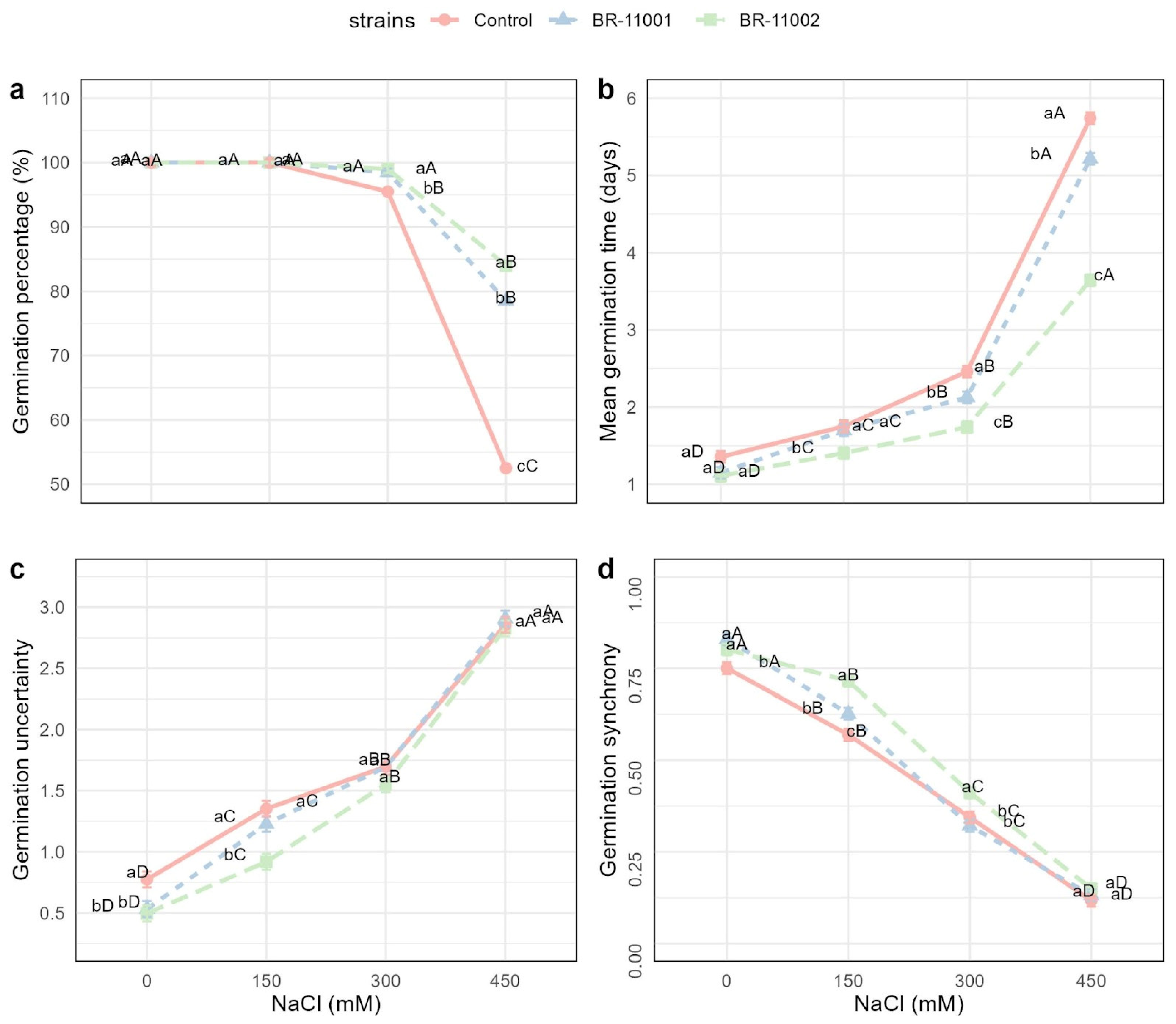 Figure 3. Germination responses of C. quinoa seeds inoculated with A. brasilense BR-11001 and BR-11002 under NaCl concentrations ranging from 0 to 450 mM (n = 4). (a) Germination percentage, (b) mean germination time, (c) germination uncertainty, and (d) germination synchrony. The error bars represent ± SEs. Lowercase letters indicate differences among strains within each salinity level; uppercase letters indicate differences among NaCl levels within each strain (Tukey’s HSD, p < 0.05).