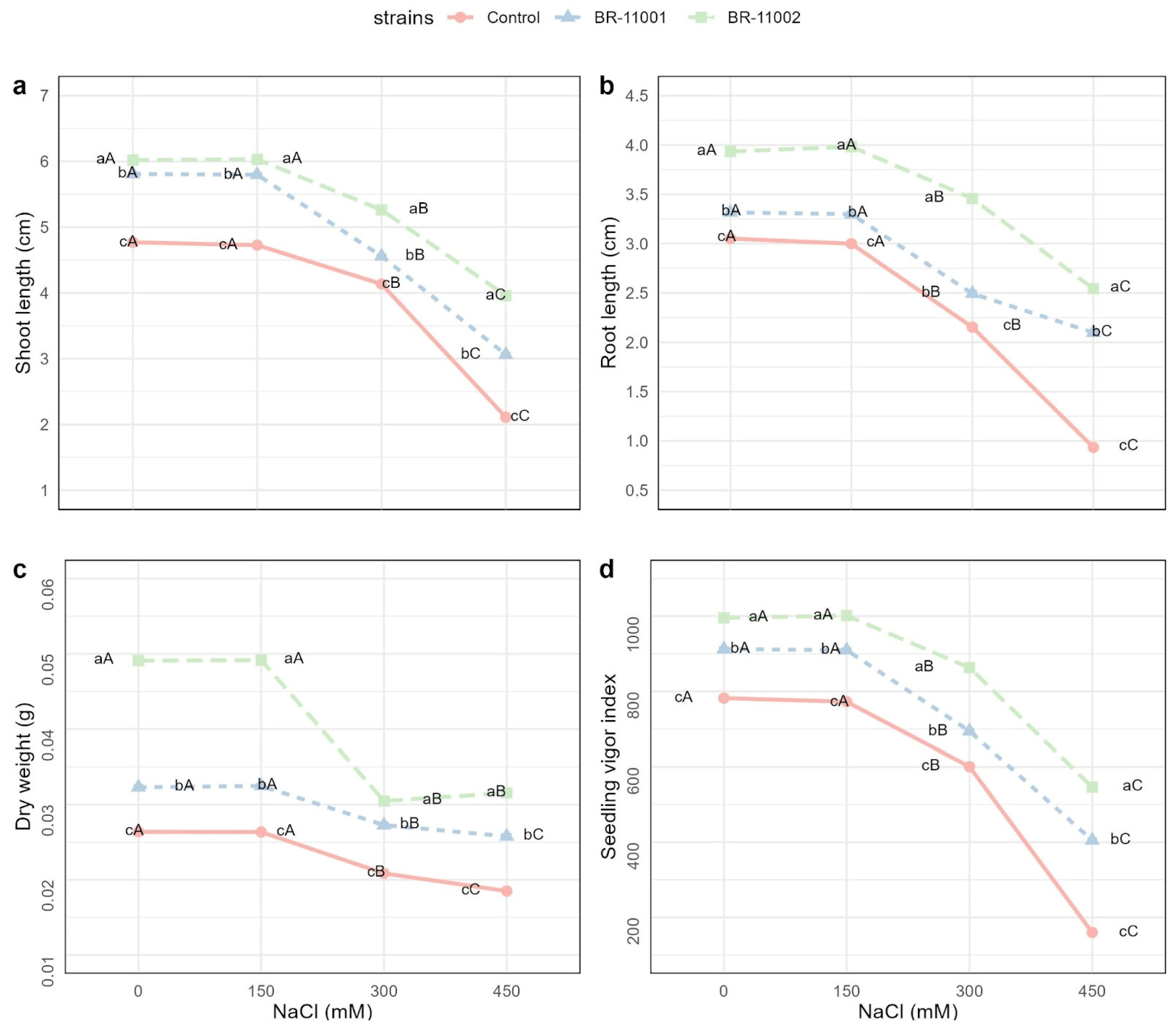 Figure 4. Traits of Chenopodium quinoa seedlings inoculated with A. brasilense BR-11001 and BR-11002 under NaCl stress. (a) Shoot length, (b) root length, (c) dry biomass, and (d) seedling vigor index. The data represent the means ± SEs (n = 4). Different lowercase letters denote significant differences among strains within each NaCl level; uppercase letters indicate differences among NaCl levels within each strain (Tukey’s HSD, p < 0.05).