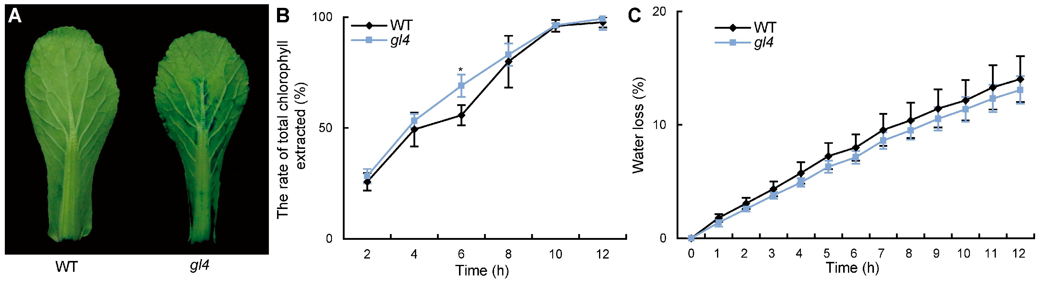 2.2. The Cuticle Permeability of the gl4 Mutant Is Decreased