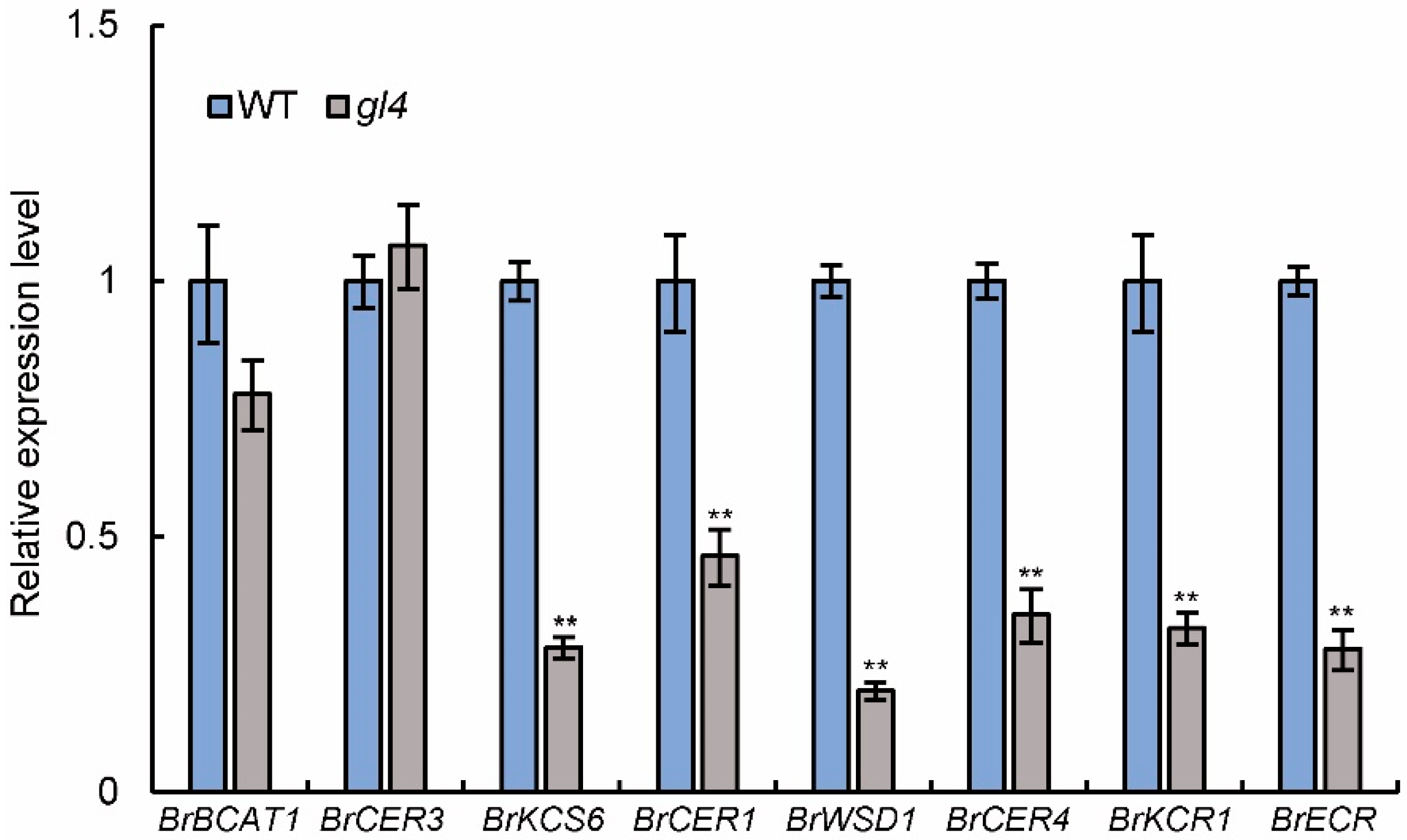 2.5. Expression of Wax-Related Genes Is Down-Regulated in the gl4 Mutant