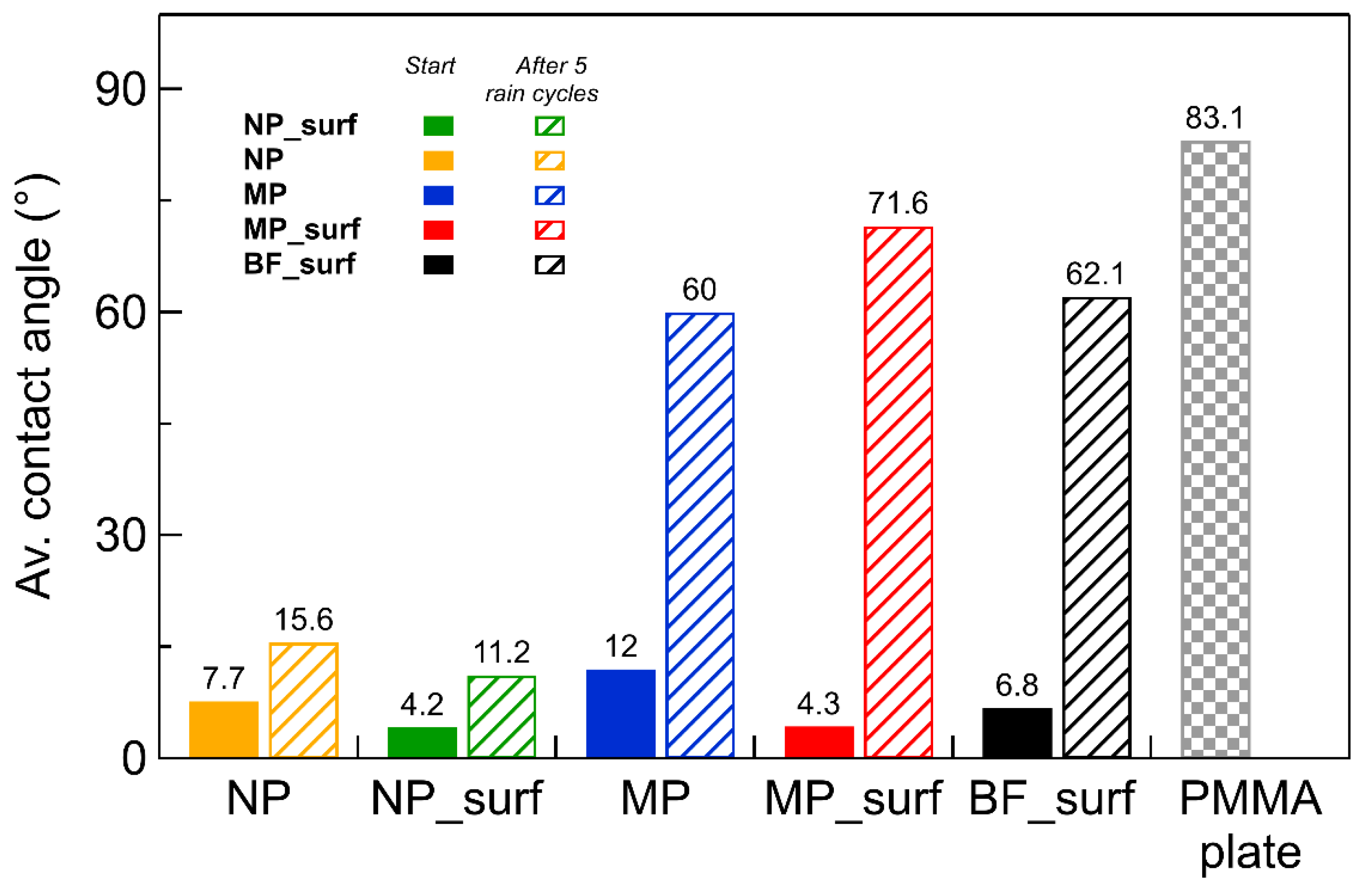Section 4 and applied to a rough PMMA surface. The values correspond to freshly prepared coatings (solid bars) versus samples subjected to five rinsing steps (hatched bars). WCA was also measured on the bare PMMA surface for comparison (gray, patterned bar). The initial WCA is small for all the coatings, ranging from 4° to 12°, and therefore substantially lower than the ca. 83° measured on bare PMMA. The WCA increases upon rinsing, but to a different extent depending on the nature of the coating. Indeed, two distinct behaviors are observed for coatings with nanoparticles and microparticles. After five rinsing steps, the WCA of the coatings with nanoparticles increases slightly up to ca. 11° and 16° for samples with and without surfactant, respectively. Instead, the increase in WCA after rinsing is much more pronounced for the coatings containing microparticles, reaching values of 72° and 60° for samples with and without surfactant, respectively. The latter values resemble the WCA measured on the base formulation coating (without mineral particles) and compare well with the WCA measured on the bare PMMA plate.