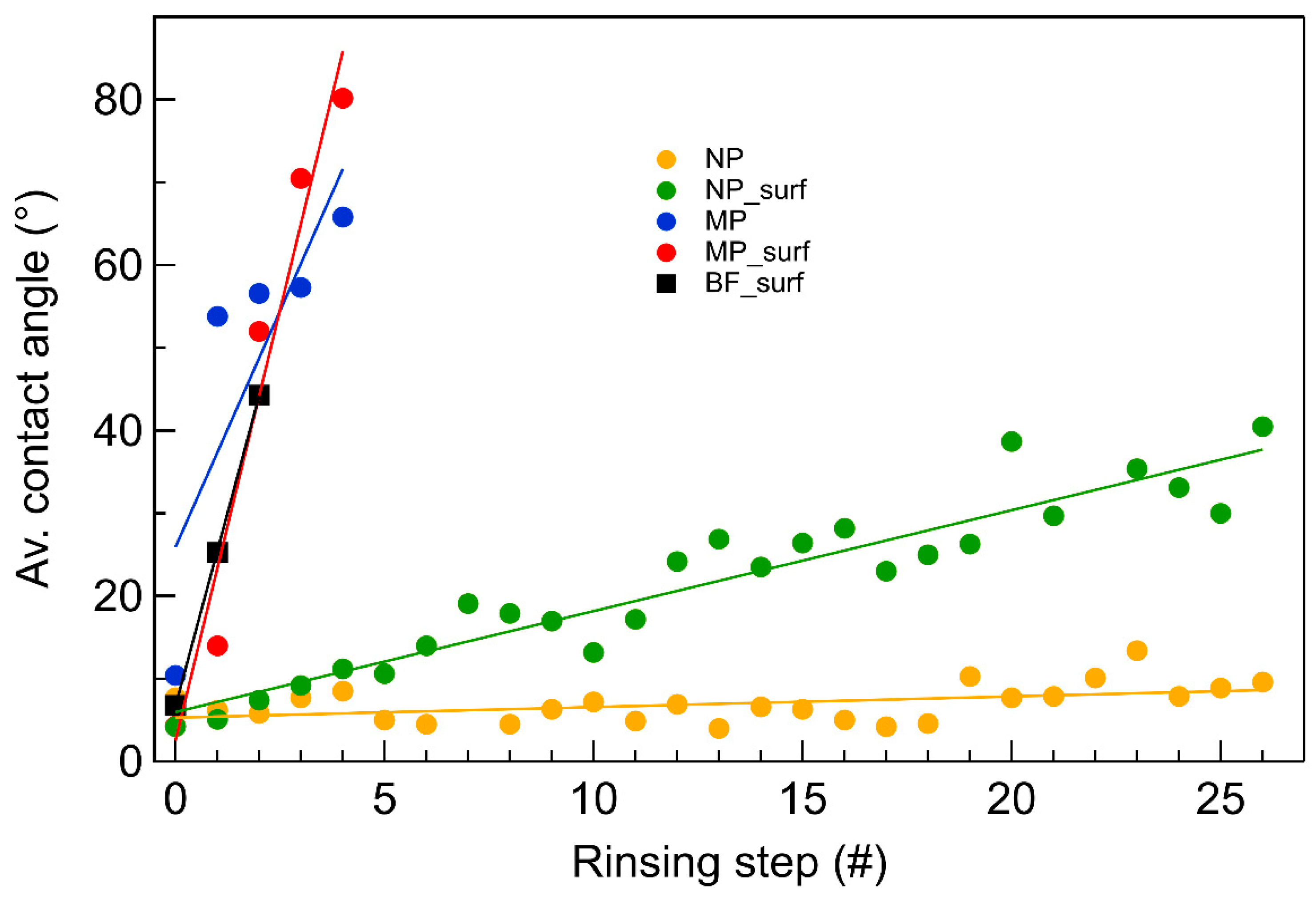 Figure 2. The WCA of these coatings increases to above 40° already after two rinsing steps. On the other hand, for the coatings containing nanoparticles, the WCA change is much lower. Specifically, the WCA measured on the coating with nanoparticles and surfactant (green dots) increases up to about 40° only after 25 rinsing steps, while the WCA measured on the coating without surfactant (yellow dots) only shows a minor increase from 7° to about 10°.