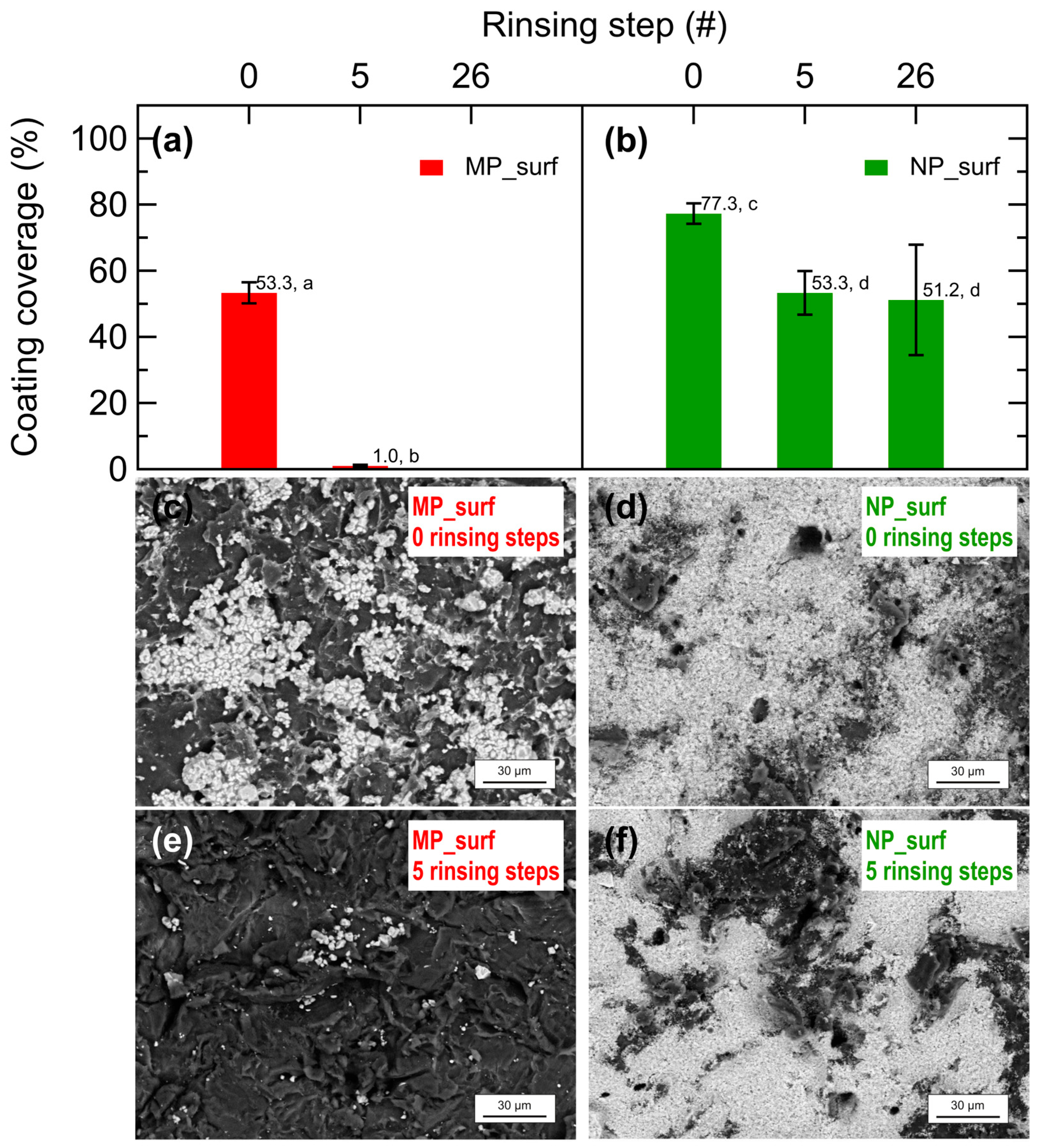 Figure 4. The figure shows the coating coverage of MP_surf (a) and NP_surf (b) on PMMA substrates after 0, 5, and 26 rinsing steps. Microparticle coatings exhibited a sharp decline in coverage, dropping from approximately 53% initially to nearly 0% after five rinses, indicating poor retention. In contrast, nanoparticle coatings maintained substantially higher coverage, decreasing from approximately 77% to ca. 51% even after 26 rinses, which suggests superior adhesion and rainfastness compared to microparticles. Notably, statistical analysis confirms significant effect of particle size and rinsing steps on coating coverage across all rinsing condition. Representative SEM images of the as-prepared coatings and those after five rinsing steps for microparticles and nanoparticles are shown in