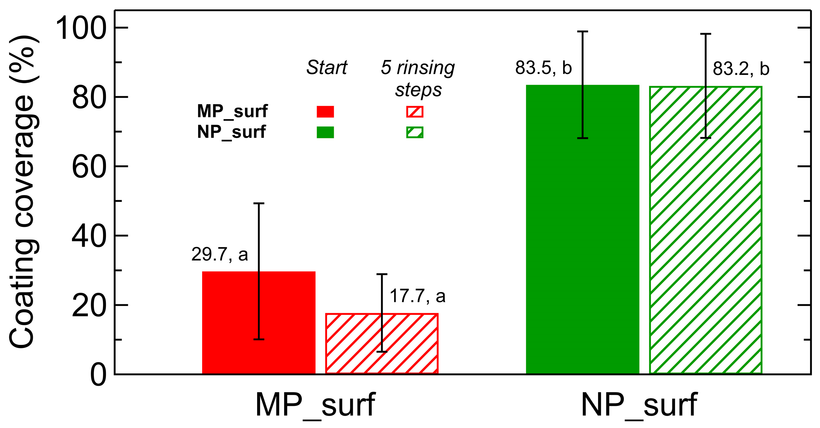 Figure 4 confirm that the microparticle coating not only results in a lower absolute coverage but is also less resistant against removal by water washing compared to coating with nanoparticles.