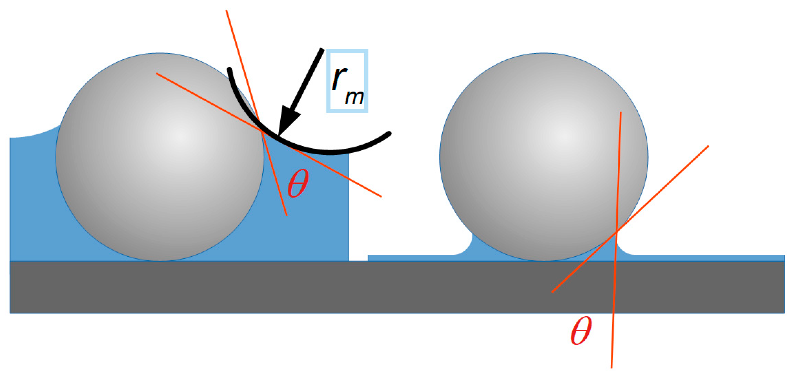 Figure 6 for the case of spherical particles, the thinner the liquid film becomes through evaporation, the stronger the meniscus curvature and the stronger the Laplace pressure become. Another consequence of the Laplace pressure around the particles is that the menisci trigger strong adhesion to the surface.
