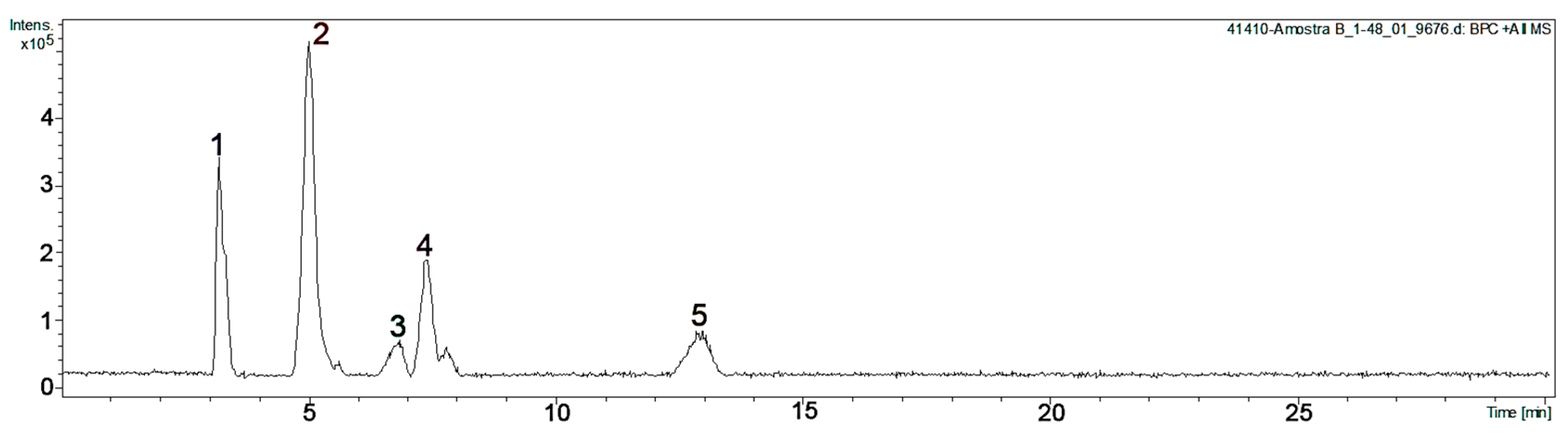 4.5. Analysis of EA-E by High-Performance Liquid Chromatography Coupled to High Resolution Electrospray Ionization Mass Spectrometry (HPLC-HR-ESI-MS)