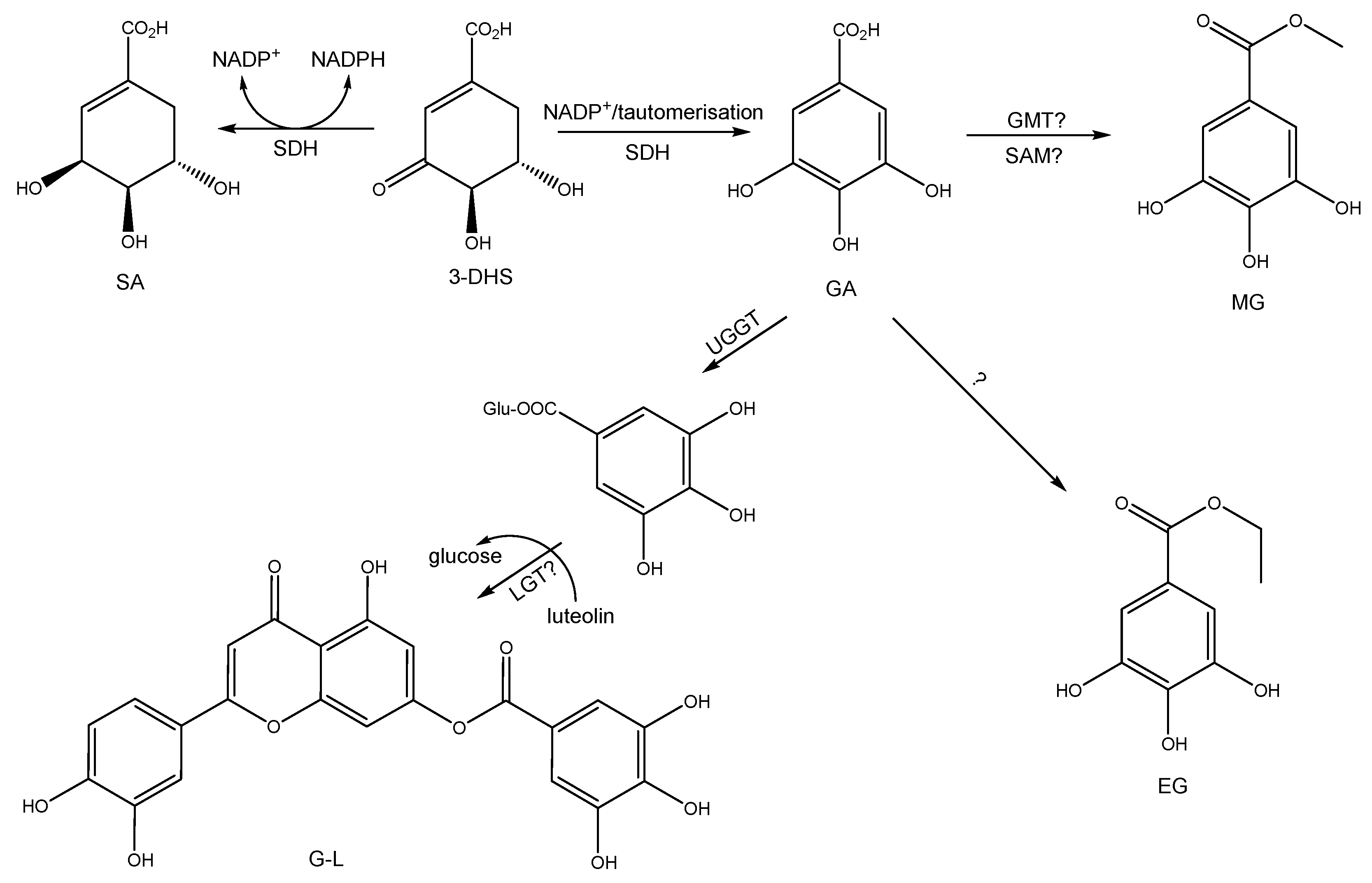 - Dewick, P.M.; Haslam, E. Phenol biosynthesis in higher plants. Gallic acid. Biochem. J. 1969, 113, 537. [Google Scholar] [CrossRef] [PubMed]