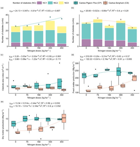 In both the cactus–pigeon pea and cactus–sorghum systems, fresh matter production and cladode area index (CAI) did not show significant responses to nitrogen fertilisation (p > 0.05) (Figure 1c,d). In the cactus cultivation system with pigeon pea and sorghum, dry matter productivity fit significant quadratic regression models (p ≤ 0.05). Increasing the nitrogen dose from 0 to 300 kg ha−1 increased dry matter production in the pigeon pea system by 24%; however, there was a loss of productivity at 450 kg N ha−1 (Figure 1e). In turn, the cactus–sorghum, a dose of 450 kg N ha−1 provided a significant increase in dry matter production (87%) compared to a dose of 0 kg N ha−1 (Figure 1e).