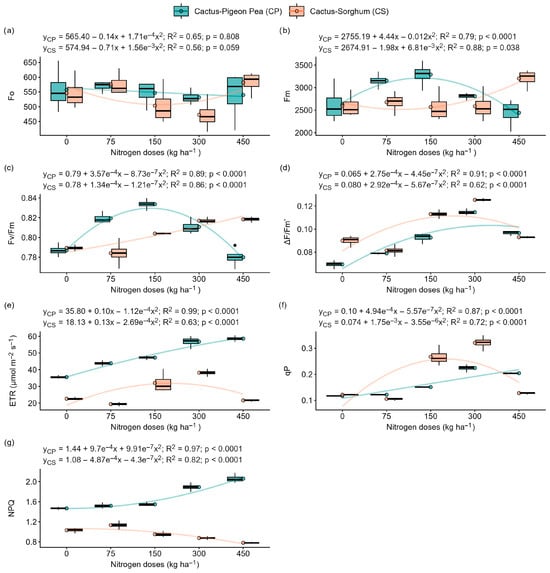 Photochemical responses of the ‘Orelha de Elefante Mexicana’ forage cactus in intercropping systems under different doses of nitrogen fertiliser (0, 75, 150, 300 and 450 kg ha−1). Initial fluorescence (Fo) (a), maximum fluorescence (Fm) (b), maximum quantum yield of photosystem II (Fv/Fm) (c), effective quantum yield of photosystem II (ΔF/Fm′) (d), relative electron transport rate (ETR, μmol m−2 s−1) (e), photochemical quenching (qP) (f) and non-photochemical quenching (NPQ) (g). Each box represents the interquartile range (25th–75th percentile), with whiskers extending to the 5th and 95th percentile values, and a horizontal line within the box indicating the median. The solid lines represent the regression fits of the dependent variables versus nitrogen doses.