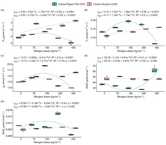 Physiological responses of the ‘Orelha de Elefante Mexicana’ forage cactus in intercropping systems under different doses of nitrogen fertiliser (0, 75, 150, 300 and 450 kg ha−1). Net photosynthetic rate (Pn) (a), transpiration (Tr) (b), stomatal conductance (gs) (c), instantaneous water use efficiency (WUE) (d) and intrinsic water use efficiency (WUEi) (e). Each box represents the interquartile range (25th–75th percentile), with whiskers extending to the 5th and 95th percentile values, and a horizontal line within the box indicating the median. The solid lines represent the regression fits of the dependent variables versus nitrogen doses.