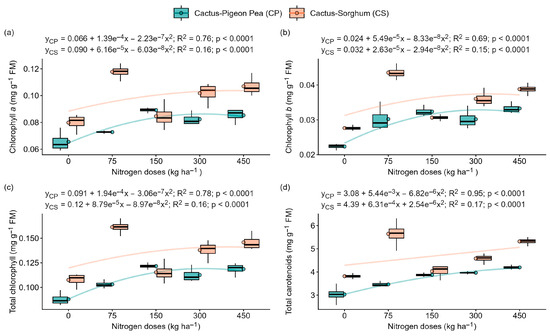 The content of chlorophyll a, chlorophyll b, total chlorophyll and total carotenoid exhibited a significant fit to a quadratic regression model (p < 0.0001) in both cropping systems: forage cactus–pigeon pea and forage cactus–sorghum (Figure 4). In the cactus–pigeon pea system, the levels of chlorophyll a, chlorophyll b, total chlorophyll, and total carotenoids increased by of 30%, 49%, 38% and 38%, respectively, in response to nitrogen fertiliser application ranging from 0 to 450 kg ha−1 (Figure 4a–d). Similarly, in the cactus–sorghum system, pigment levels rose by 34%, 40%, 36% and 39%, respectively, in correlation with increased nitrogen availability (Figure 4a–d).