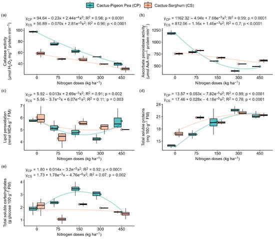 Our results showed that catalase (CAT) and ascorbate peroxidase (APX) activity, lipid peroxidation (MDA), and protein and total soluble carbohydrate contents exhibited significant quadratic responses to nitrogen doses (p < 0.05) in both cropping systems (forage cactus–pigeon pea and forage cactus–sorghum) (Figure 5). In the cactus–pigeon pea intercropping system, plants grown without nitrogen fertilisation (0 kg N ha−1) showed the highest CAT and APX activity. As nitrogen availability increased from 0 to 450 kg N ha−1, CAT and APX activity decreased sharply by 151% and 143%, respectively, relative to the unfertilized control (Figure 5a,b). Conversely, total soluble protein content increased by 63%, reaching maximum values at 300 kg N ha−1 (Figure 5d). In contrast, MDA content increased, and total soluble carbohydrate content decreased at the extreme nitrogen levels (0 and 450 kg N ha−1) (Figure 5c,e).