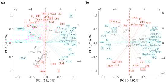 Principal component (PC) analysis of the photochemical, physiological and biochemical variables of the ‘Orelha de Elefante Mexicana’ forage cactus under different levels of nitrogen fertiliser (0, 75, 150, 300 and 450 kg ha−1) intercropped with sorghum (a) and pigeon pea (b). The PCA was performed using mean values of all analysed variables. Variables in green are allocated to the first component (PC1), in red to the second component (PC2) in grey to components three and four (PC3 and PC4).