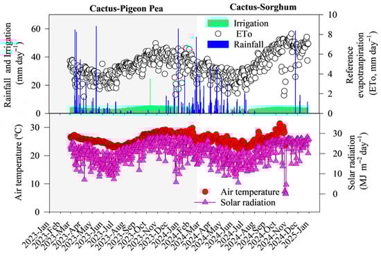 Rainfall, irrigation, reference evapotranspiration (ETo), air temperature and solar radiation during the 2023–2024 experimental period in Serra Talhada, Pernambuco, Brazil. The light grey shading represents the cactus–pigeon pea experiment, and the white shading represents the cactus–sorghum experiment. All meteorological data were obtained from the automatic weather station of the National Institute of Meteorology (INMET), located adjacent to the experimental area.