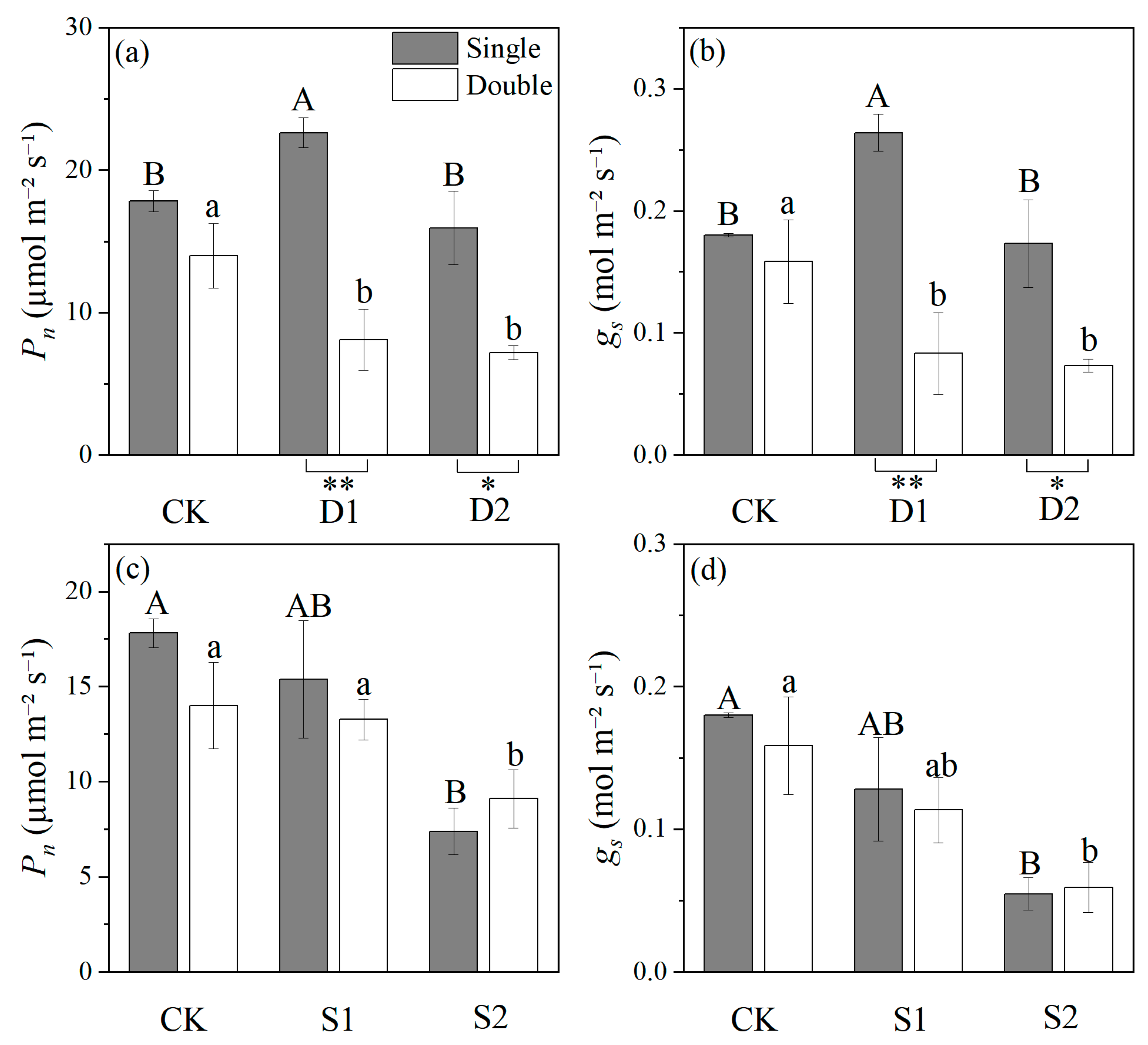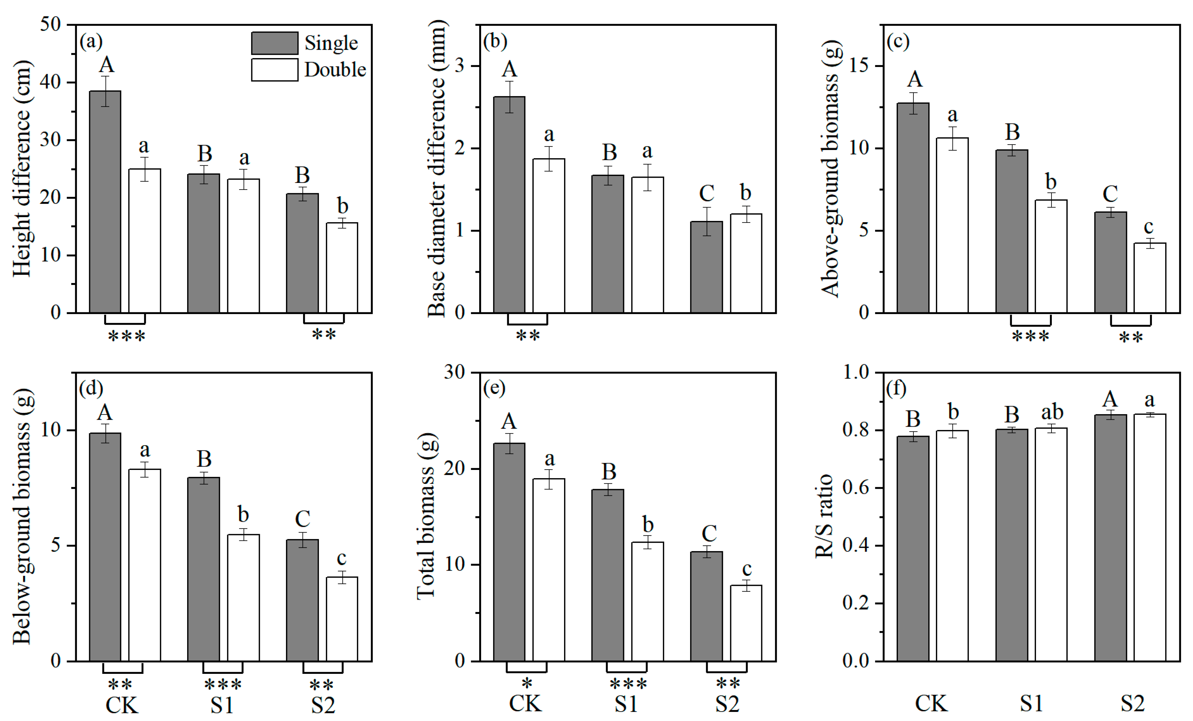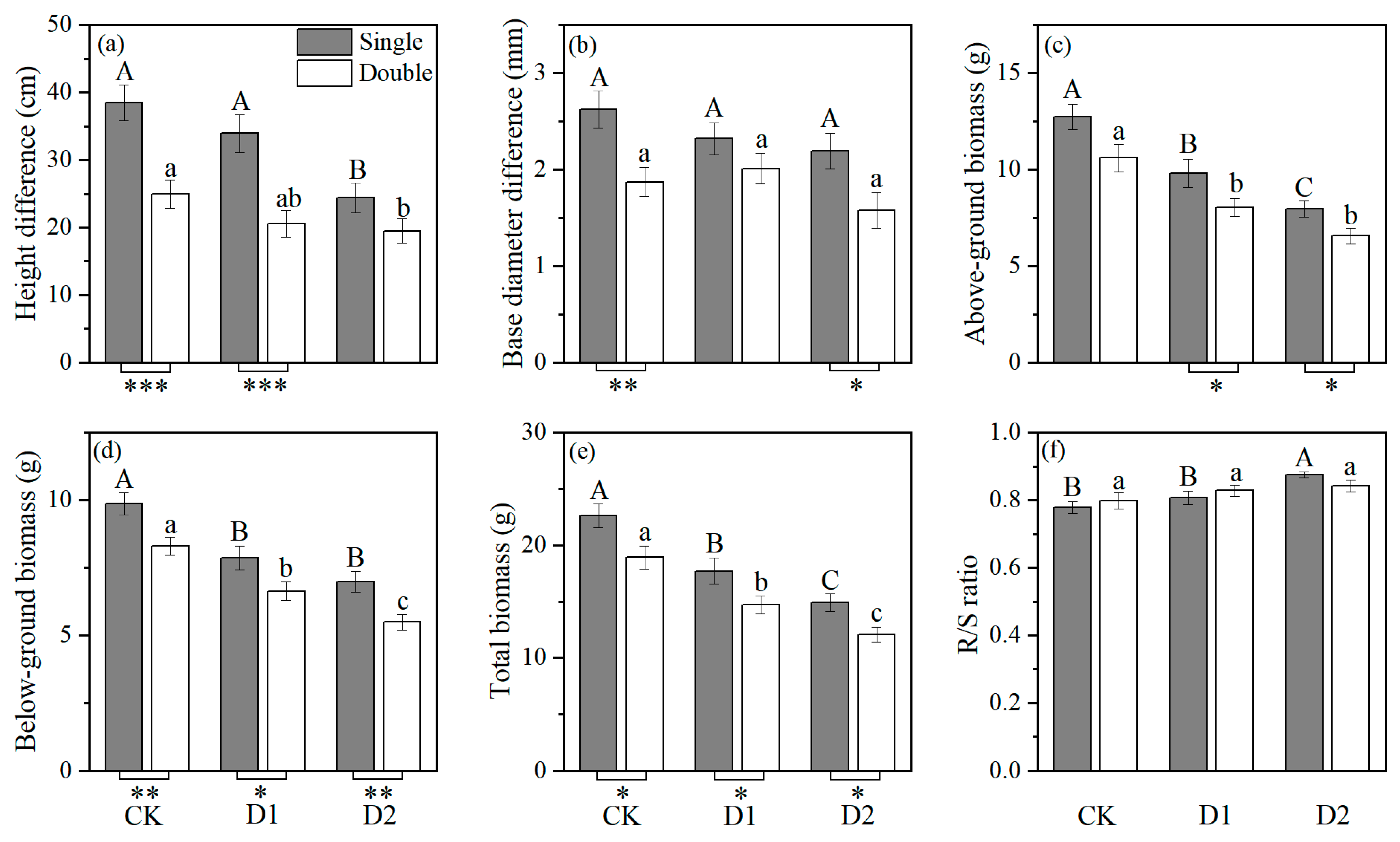 3.1. Morphological and Physiological Characteristics of Double-Planted P. euphratica Seedlings Responded More Significantly to Drought Stress