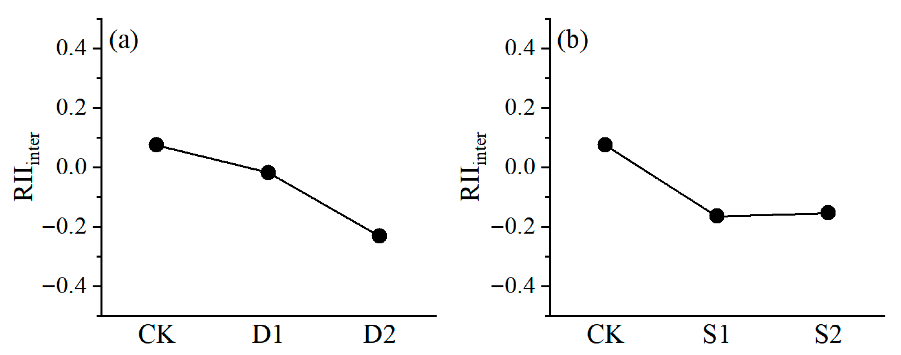 2.4. Intraspecific Relationships of P. euphratica Seedlings and Their Changes Across the Stress Gradient