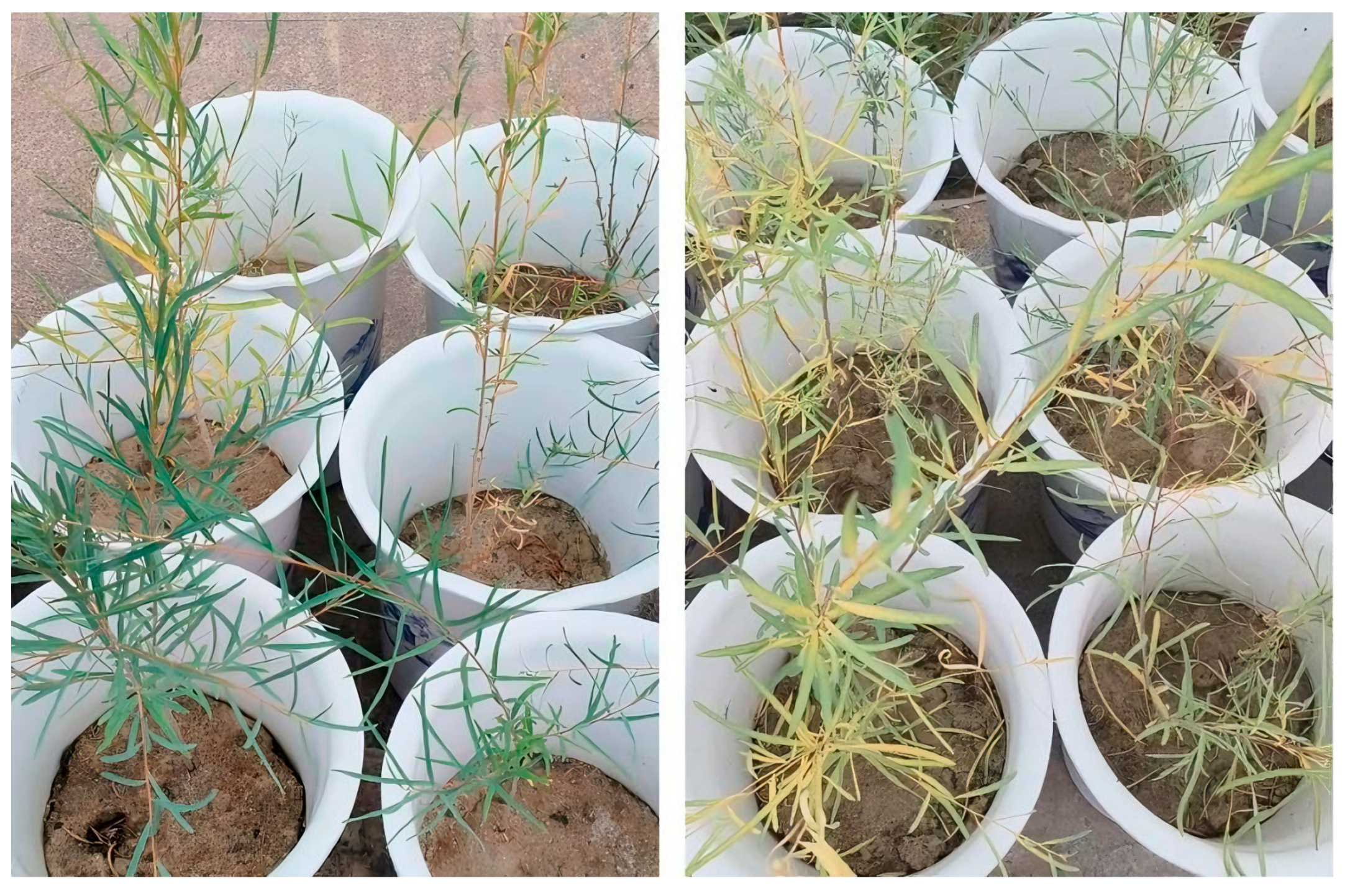 - Yu, L.; Huang, Z.; Tang, S.; Korpelainen, H.; Li, C. Populus euphratica males exhibit stronger drought and salt stress resistance than females. Environ. Exp. Bot. 2023, 205, 105114. [Google Scholar] [CrossRef]