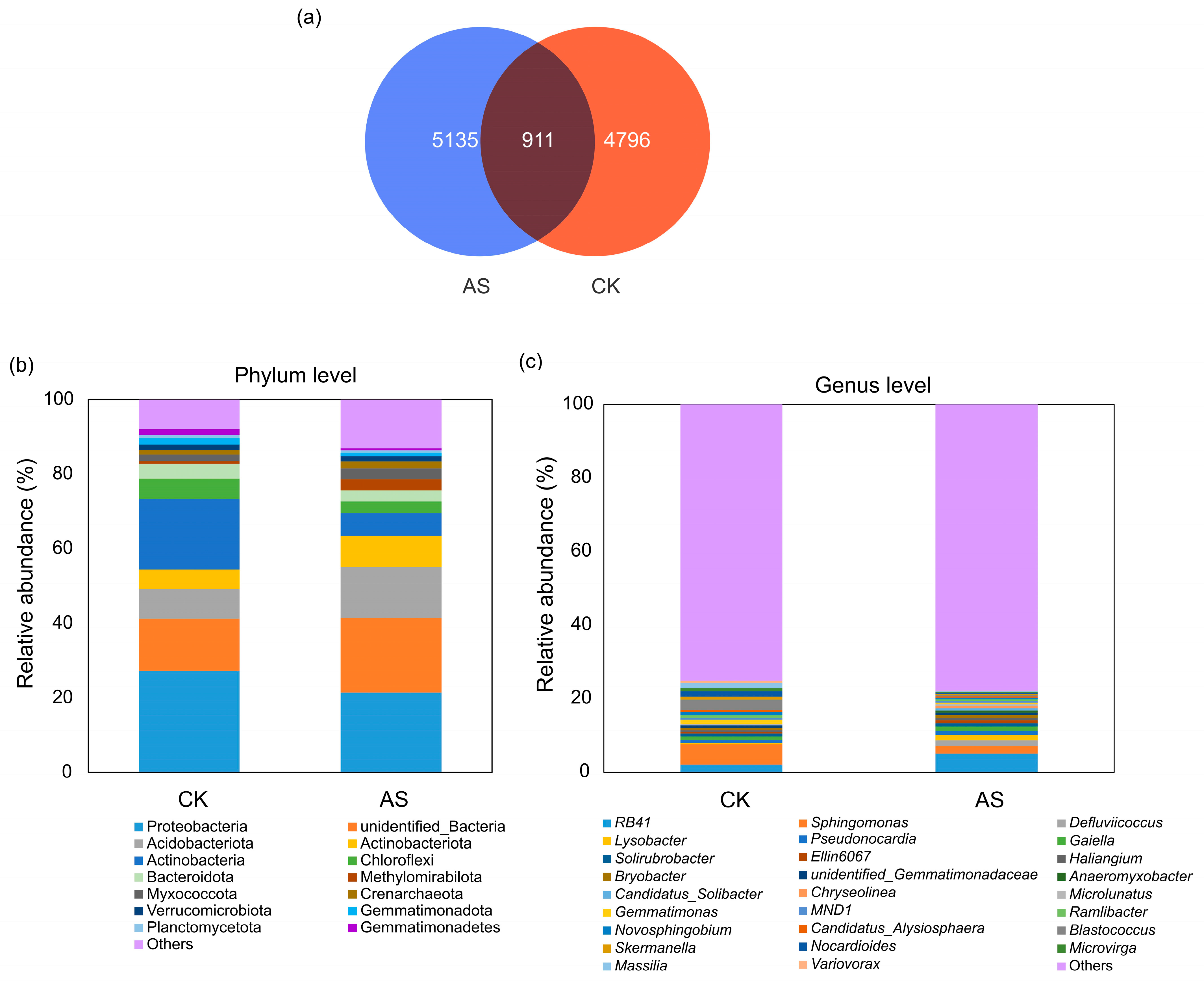 A total of 60 bacterial phyla were identified, among which the following 11 were dominant (relative abundance ≥ 1%) in AS: Proteobacteria, unidentified_Bacteria, Acidobacteriota, Actinobacteriota, Actinobacteria, Chloroflexi, Bacteroidota, Methylomirabilota, Myxococcota, Crenarchaeota, and Verrucomicrobiota. By contrast, the following 13 phyla were dominant in CK: Proteobacteria, Actinobacteria, unidentified_Bacteria, Acidobacteriota, Chloroflexi, Actinobacteriota, Bacteroidota, Myxococcota, Gemmatimonadota, Gemmatimonadetes, Verrucomicrobiota, Crenarchaeota, and Planctomycetota (Figure 1b). Notably, relative abundances of Proteobacteria (21.43%), unidentified_Bacteria (20.00%), and Acidobacteriota (13.77%) were highest in AS. In CK, the most abundant phyla were Proteobacteria (27.27%), Actinobacteria (18.77%), and unidentified_Bacteria (13.93%).