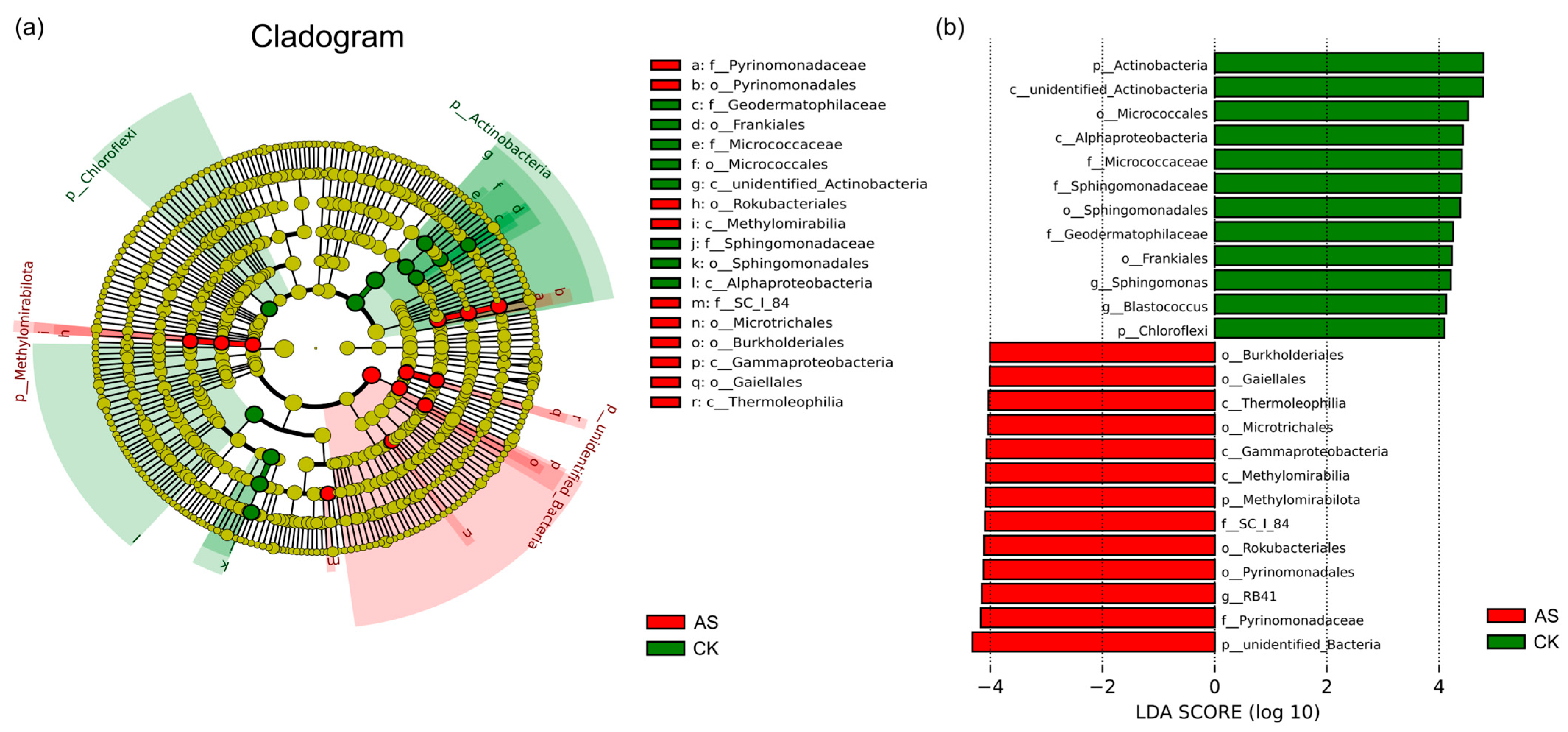 The most effective microbial biomarkers for discriminating between the two groups were determined (Figure 3b; LDA score > 4, p < 0.05). The AS group was dominated by RB41 from Acidobacteriota (LDA = 4.1), whereas the CK group was characterized by Sphingomonas from Proteobacteria (LDA = 4.2) and Blastococcus from Actinobacteria (LDA = 4.1), which was consistent with t-test results (Figure S3).
