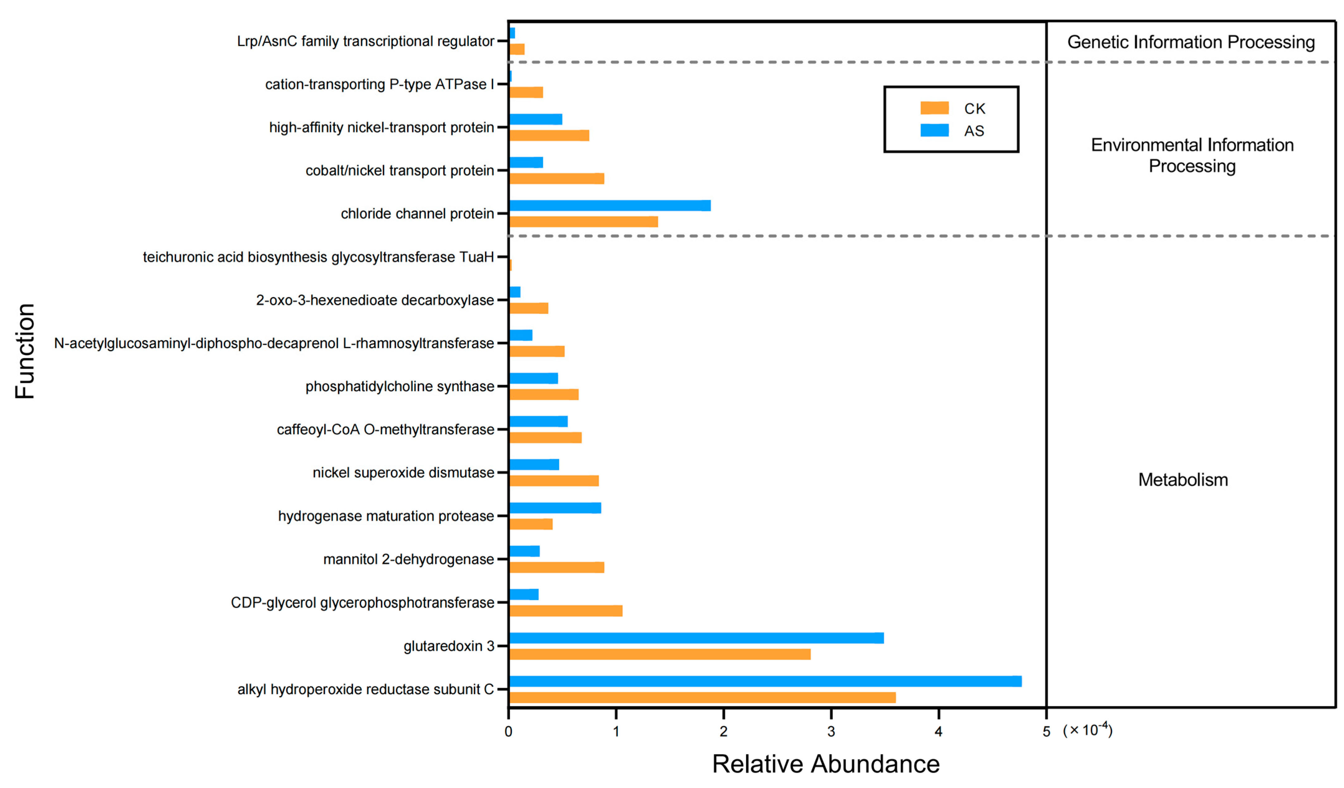 Figure 4. Differences in the abundance of bacterial genes with predicted functions between saline–alkaline soil (AS) and control soil (CK). Relative abundances of genes encoding specific stress-related proteins are presented; genes are grouped under their respective broad functional categories (e.g., Metabolism) as predicted by PICRUSt2.