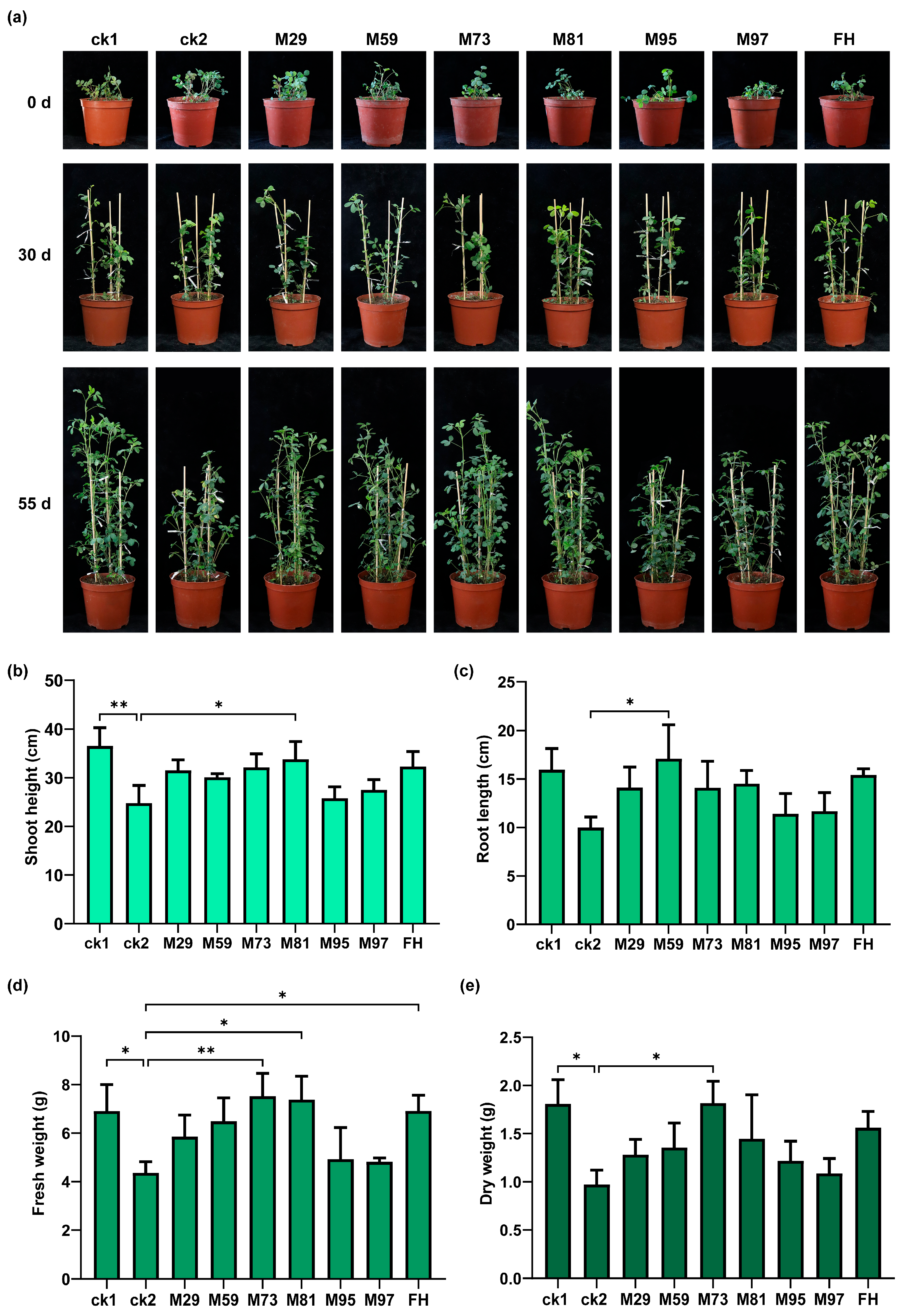 Figure 8. Effects of PGPR on alfalfa growth in the presence of NaHCO3. (a) Phenotypic characteristics, (b) shoot height, (c) root length, (d) fresh weight, and (e) dry weight; ck1: 50 mL water every 5 days + 6 mL water every 3 days; ck2: 50 mL 50 mM NaHCO3 every 5 days + 6 mL water every 3 days. Saline–alkaline conditions + bacterial inoculations (strains M29, M59, M73, M81, M95, M97, and FH): 50 mL 50 mM NaHCO3 every 5 days + 6 mL [specific bacterial strain] suspension every 3 days. Significant differences (* p < 0.05, ** 0.01 < p < 0.05) compared with ck2 (mean ± SD, n = 3; one-way ANOVA) are indicated.