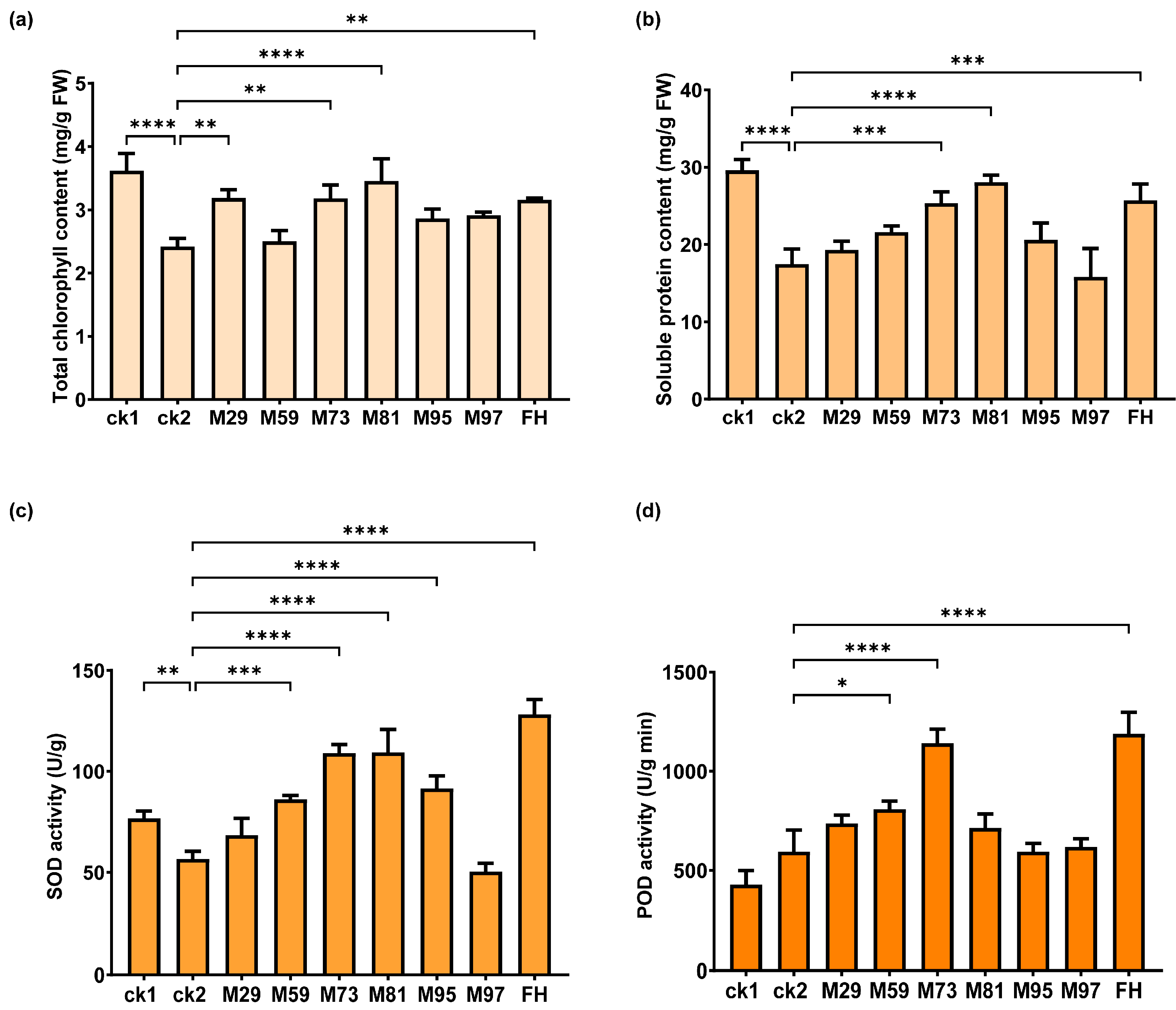 For bacterial inoculations, all groups were treated every 3 days with 6 mL bacterial suspension or sterile water. Treatment groups were inoculated with 6 mL bacterial suspension comprising single strains or FH. Control plants (ck1 and ck2) were treated with 6 mL sterile water instead of a bacterial suspension. After 55 days, plant growth indices (height, root length, fresh weight, and dry weight) and physiological indices (total chlorophyll content [81,82], soluble protein content [83], and SOD and POD activities) were determined. SOD (WST-1 method) and POD activities were measured using commercial assay kits from Solarbio Science & Technology Co., Ltd. (Beijing, China). All experiments were completed using three independent biological replicates.