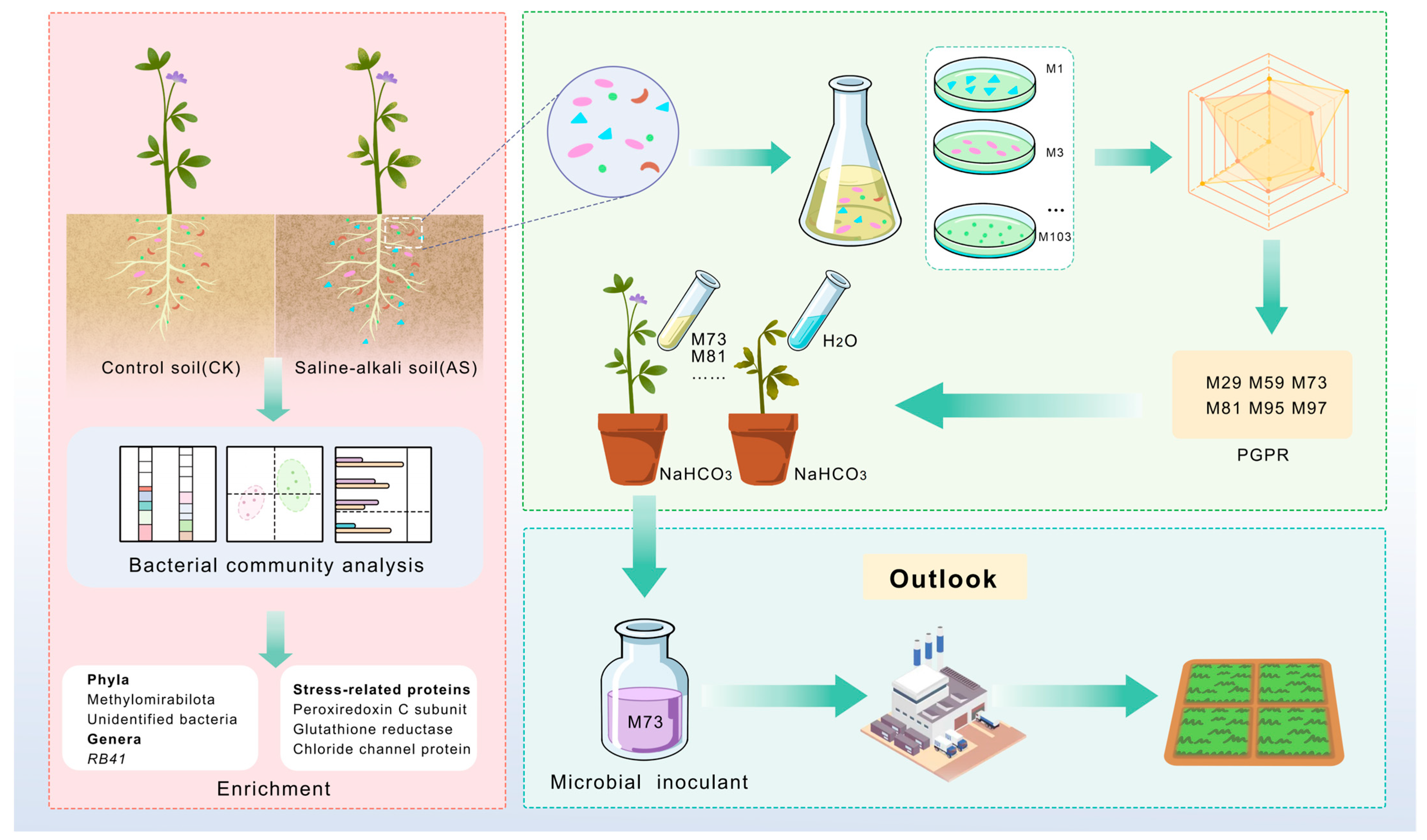 Figure 10. Overview of the isolation, validation, and potential utility of PGPR from the alfalfa rhizosphere in saline–alkaline soil.